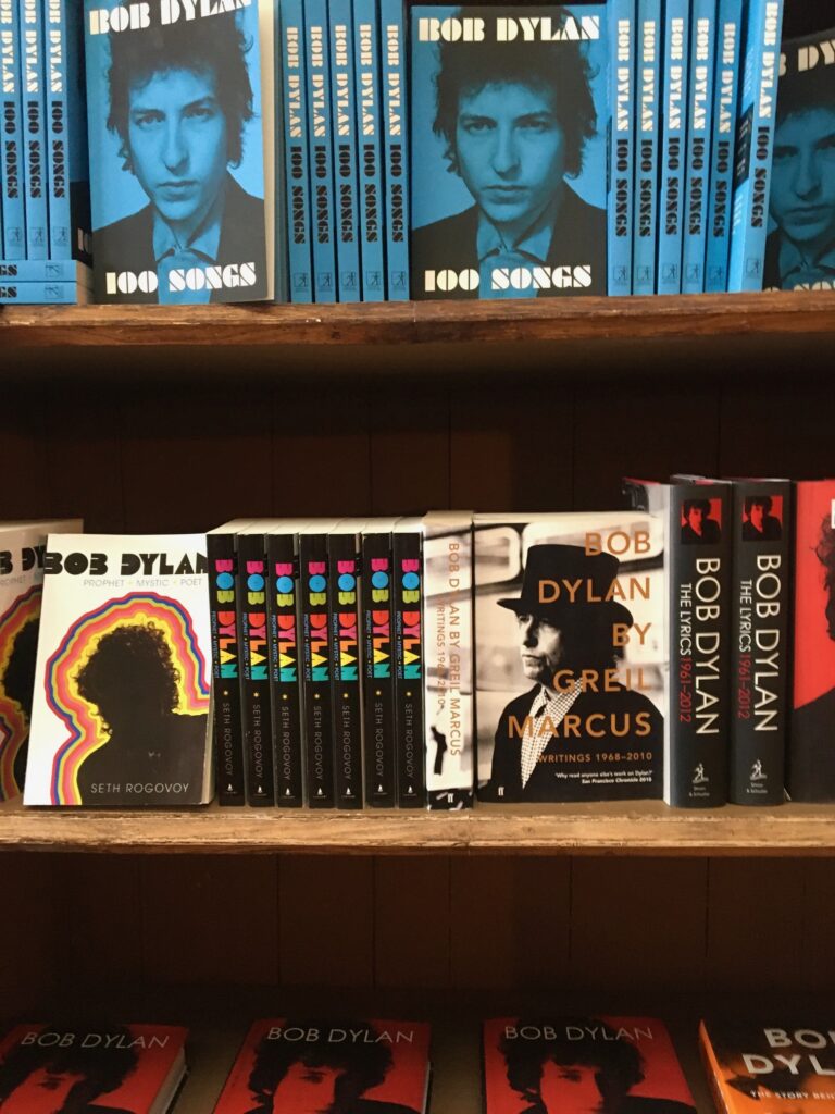 Vorig jaar hadden we de kans om deel te nemen aan die veiling van die 42 brieven van Bob Dylan. En omdat we toen ons concept als boekhandel aan het herzien waren… We besloten om meer aandacht te besteden aan wereldliteratuur en de Nobelprijs literatuur in het bijzonder. Je ziet hier die foto’s van covers van Time Magazine. En hier zie je enkele schappen met boeken van Nobelprijswinnaars literatuur. Dus uiteraard ook Bob Dylan. En ook een overzicht van genomineerden voor de Nobelprijs en van kanshebbers op die prijs.