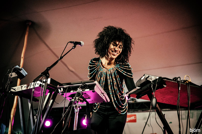 Heel voorzichtig komt Esinam de gouden zaal van kunstencentrum Nona te Mechelen binnen getrippeld. Helemaal in haar eentje begint ze eraan, voor haar muzikanten erbij komen en invallen op gitaar, bas en drums. Al de rest doet Esinam zelf: met haar dwarsfluit, stem, toetsen, percussie en duizenden knopjes neemt ze je mee naar een magisch universum. Dit is wervelende, jazzy muziek die nergens mee te vergelijken valt. Je moet je gewoon laten onderdompelen.