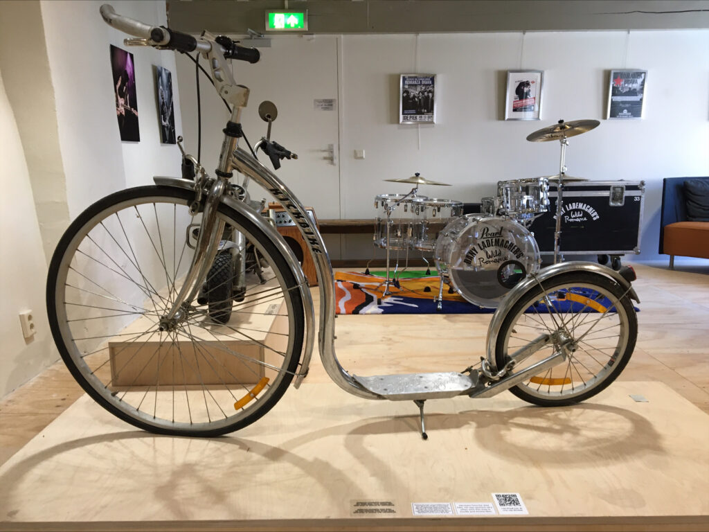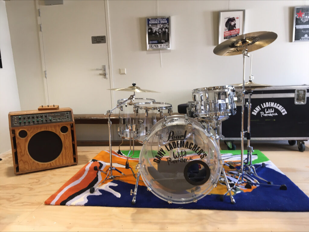 Ja, we hebben hierboven die expositie nu. Die hebben hier vorige week opgetreden. Het drumstel van Dany staat er nog. Ook een heel ouwe versterker. David Hollestelle is er nog bij. Die jongens treden nog twee, drie keer per week op voor uitverkochte zalen. Leuk om te zien en te horen. Ze komen hier ook nog regelmatig. Ook leuk dat Hans hier nog elke zondag is. Ouwe rockers, hè (lacht). Maar we zijn hier elke dag mee bezig…