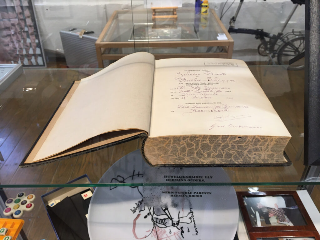 Ja dat mag je wel zeggen. Maar het is leuk om doen. We hebben ook een leuke webshop. We zijn hier eigenlijk zeven dagen per week mee bezig. Administratie en zo, de hele zooi. Ik doe heel veel met Sandra, de weduwe van Herman. Die krijgt ook nog een percentage van de verkoop. Dat moet je allemaal netjes regelen. Dat gaat goed. Als ik muziek erbij neem, dat mag dit museum drie keer groter zijn. Er zijn heel veel dingen die ik dan aangeboden krijg, maar je moet er maar ruimte voor hebben. Dit museum is dus meer gebaseerd op zijn schilderkunst en Herman de kunstenaar. Op de opening was Johan Derksen hier. Dat stond in de krant. En toen kwam er de volgende dag een man uit Uithuizermeeden in het noorden van de provincie Groningen. Die kwam een bijbel brengen uit Heemskerk. Dat was de huwelijksbijbel van de ouders van Herman. Vroeger kreeg je bij het huwelijk zo’n bijbel. Dat is wel leuk dat je die dingen krijgt.
