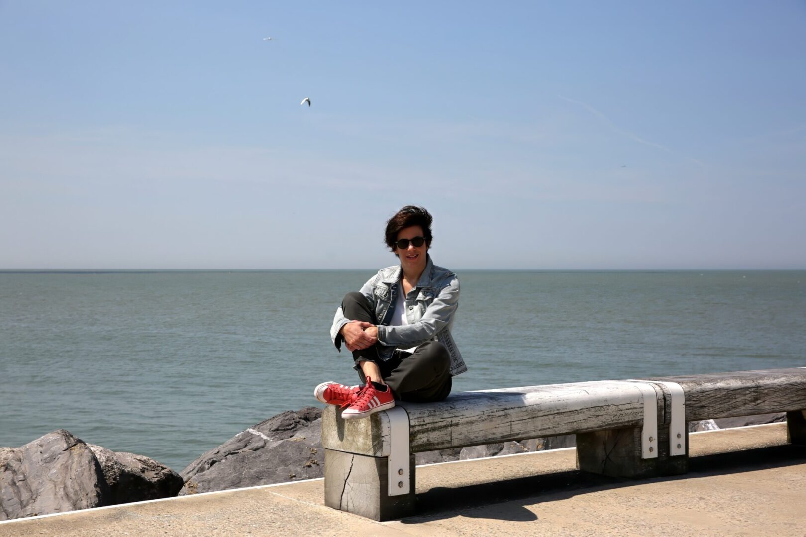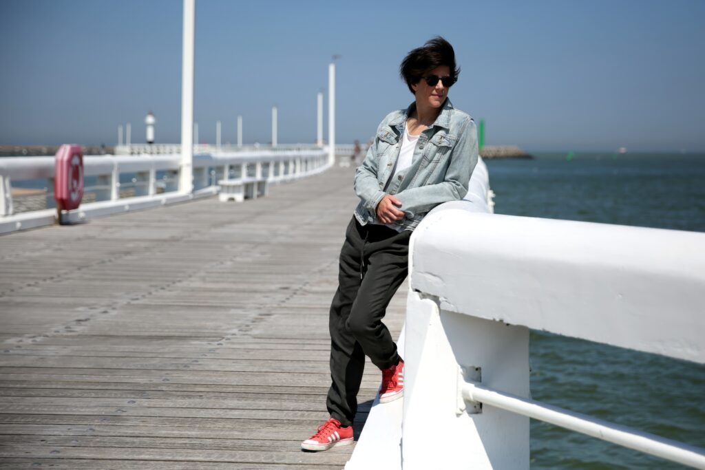 Ja, ik ben daar niet goed in, in dat poseren. Zoals vandaag ook. We gaan foto’s nemen en je zorgt dan dat je haar goed ligt en dergelijke maar ja, we zijn aan de kust. De wind is zo ongenadig voor een kapsel. En ik trek steeds vreemde gezichten ook, op foto’s. Dat vind ik van mezelf toch.