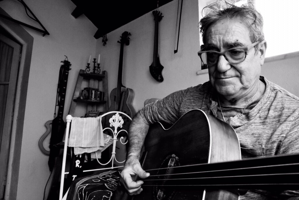 Dat is mijn Portugese basgitaar. Na Sail-Joia heb ik een half jaartje sabbatical genomen. Ik kwam met mijn vriendin van het noorden naar Portugal. Ik kwam in Lissabon bij mijn vriend Pedro. En daar luisterde ik toen naar fado. Fado is als blues : altijd hetzelfde. De bassist had een bas die anders gestemd was. In plaats van E A D G, was het G D A E. Maar het klonk zo mooi ! Hij zei me dat ze dat niet meer maken, het is dus nog steeds met een stemmachine. Toen ik hoorde dat ze die niet meer maken, wou ik toch zo’n akoestische basgitaar hebben. Iemand heeft ze speciaal voor mij gebouwd. Ik heb altijd hetzelfde geluid, maakt niet uit welke gitaar ik heb. Ik speel nu vaak ukelele bas. Ik heb veel sessiewerk gedaan. Ook veel geleerd van mijn schoonvader. Ik ben een Latino. Het is een ander gevoel. Sicilianen en Italianen swingen. De flamenco swingt ook, maar de rest van Spanje… In Portugal heb je veel subcultures, maar we zijn altijd in het midden van alles.