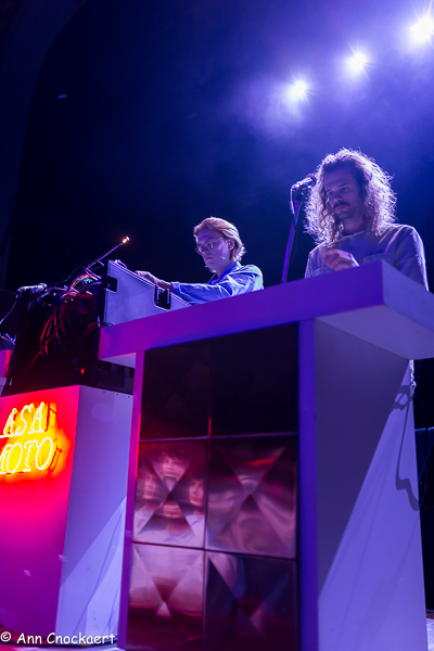 Maar eerst Asa Moto. Een logische keuze, want Charlotte Adigéry is een ontdekking van het DeeWee-label van de gebroeders Dewaele. Tijdens de set grapte Charlotte wel dat ze zo’n artieste is die twee projecten nodig heeft (dat andere is uiteraard WWWater waar naast Boris Zeebroek ook Steve Slingeneyer deel van uit maakt), maar onder haar eigen naam opereert ze onder de DeeWee-vlag. Soms kan het leven ingewikkeld zijn, zelfs al sta je met beide voetjes zo sterk op de grond als Charlotte Adigéry. Onlangs verscheen van Asa Moto hun derde release op DeeWee. Een duo dat gevormd wordt door buddies Oliver Geerts en Gilles Noë. Live en op plaat vertaalt dat zich tot uitstekende dansmuziek die zijn mosterd haalt bij talloze EBM-acts, het altijd aanwezige Kraftwerk en natuurlijk het moedervoorbeeld Soulwax. Voor wie de dansbeentjes tijdens optredens liever thuis laat kan zo’n live-act vaak even opwindend zijn als het wonder dat je beleeft als je naar verf zit te staren die opdroogt (niet dat we daar ervaring mee hebben), maar dat is geen seconde het geval bij Asa Moto. Zalige trip, punt.