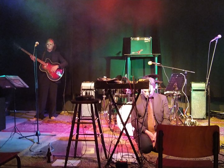 En dan komen ze op! Vier gedaanten met witte maskers in zwart maatpak. Gretig als ze zijn om nog eens voor een publiek te spelen, komen ze dan ook iets te vroeg op. Rudy neemt het op zich om het publiek te verwelkomen en vervolgens speelt zich het volgende korte dialoogje af.
