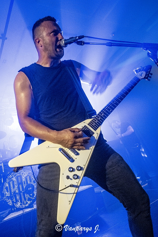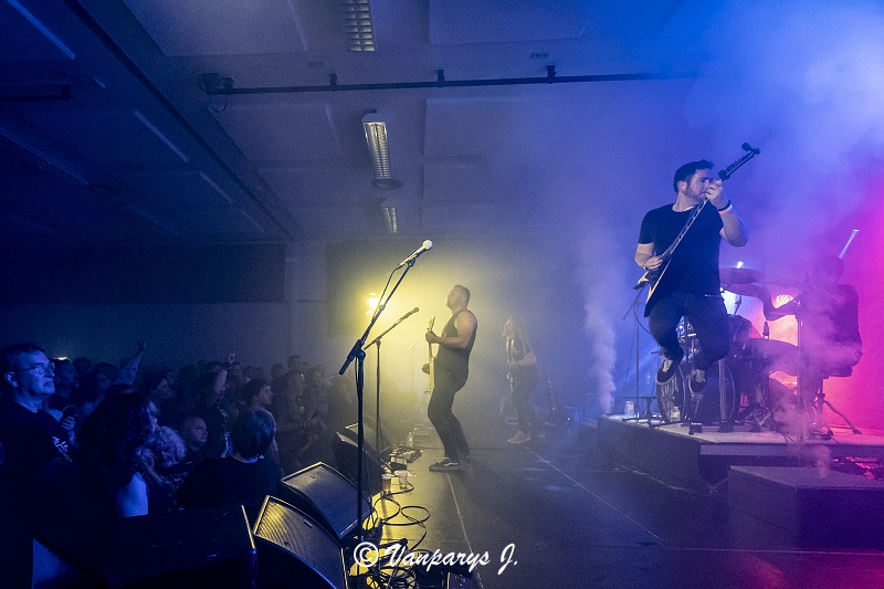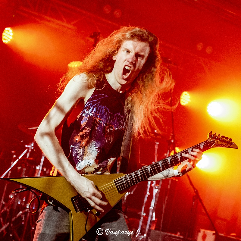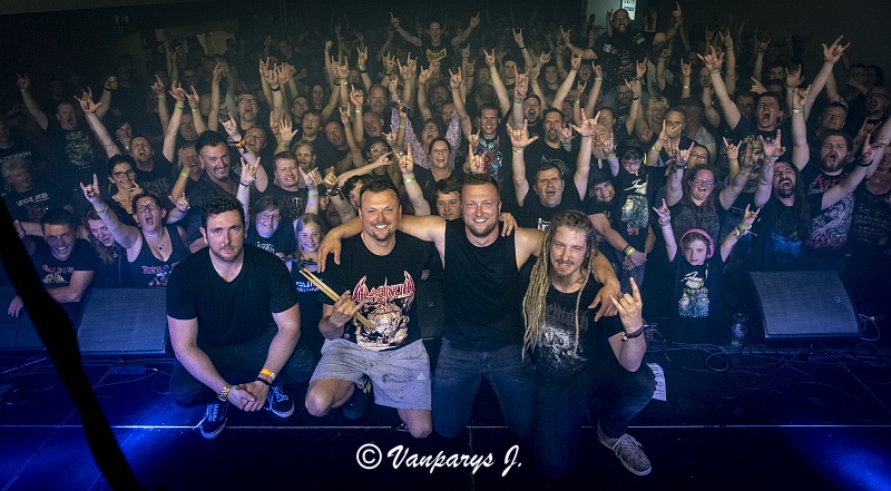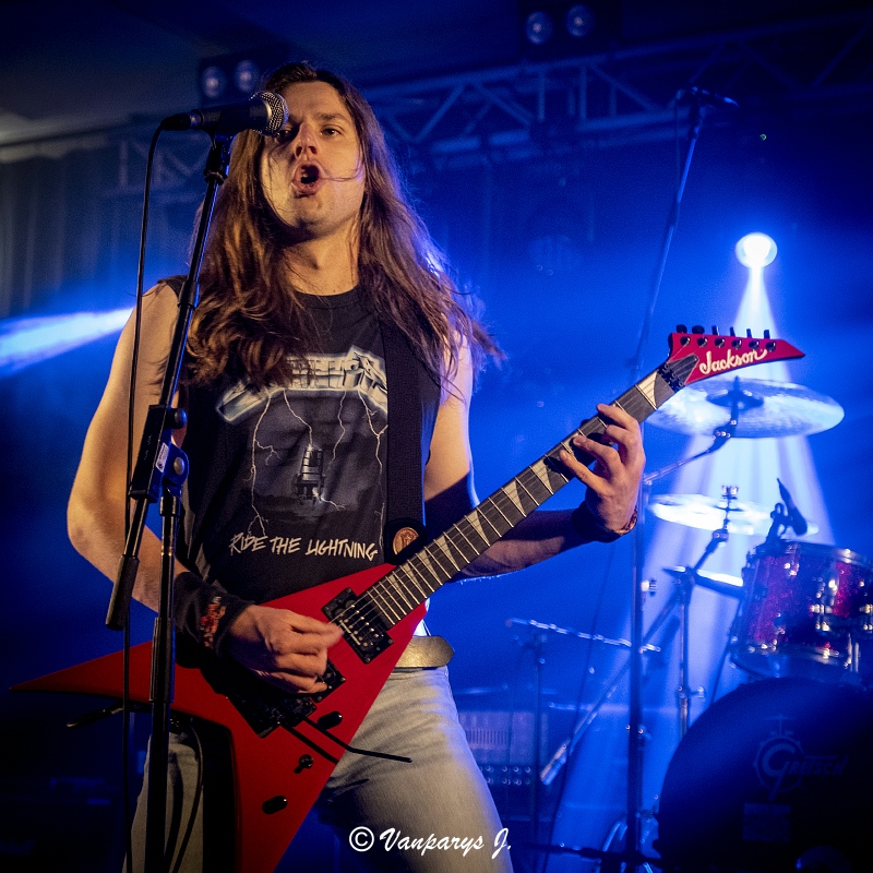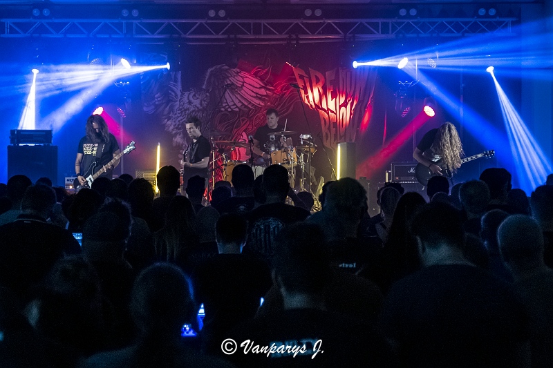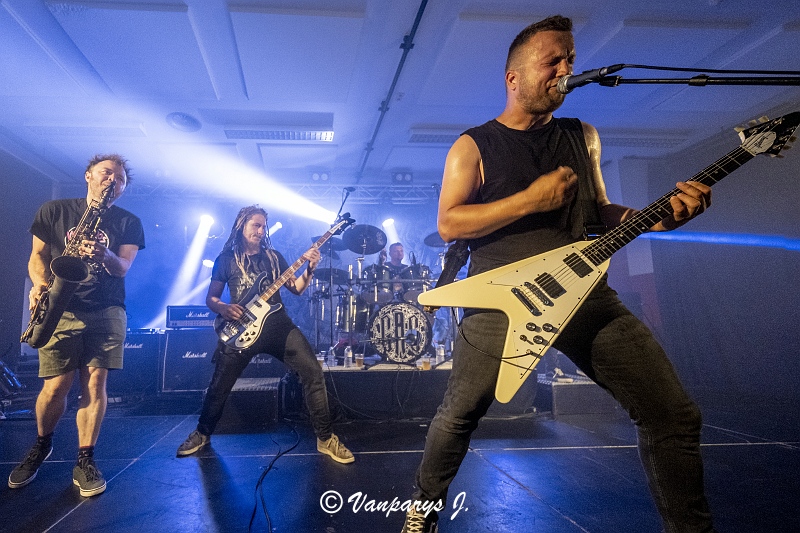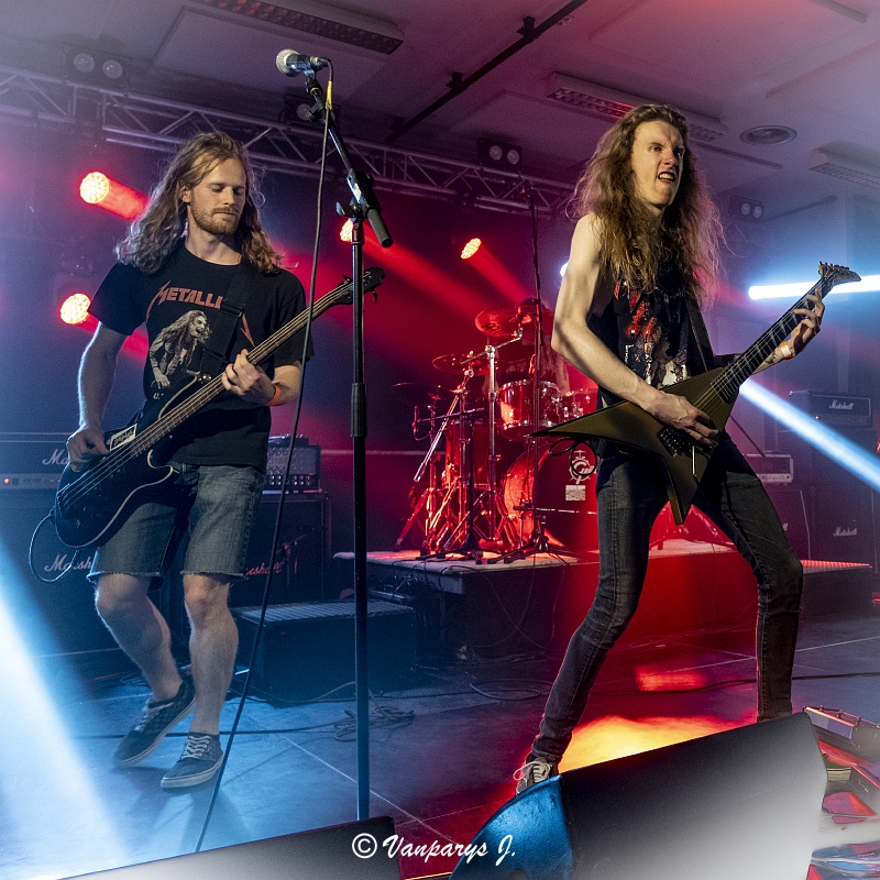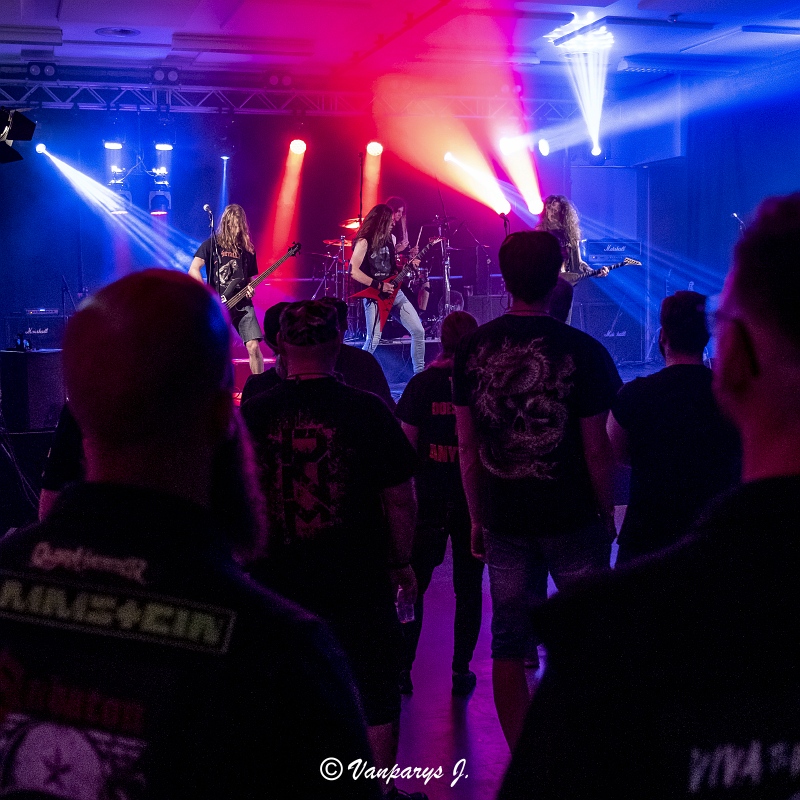 We kwamen gelukkig net op tijd aan want het thrashmetalkwartet Severdhed stond al om 19.00 uur gepland. De band uit Izegem werd in 2018 opgericht door leden van twee ontbonden West-Vlaamse thrashmetalbands Nocardia en Infantile. Bij de eerste gitaarriffs werd al snel duidelijk dat deze vier thrashwolven barsten van energie en passie. Geen poespas bij dit jonge geweld. We kregen een portie onvervalste old school thrashmetal tegen de tanden gegooid met snedig hakwerk en flitsende gitaarsolo’s. Dario Van Fleteren (gitaar en zang), Sam Parret (gitaar), Lucas Wyffels (bas) en de nieuwe vellenmartelaar Elegast Vercruysse zijn sterk beïnvloed door thrashlegendes zoals Slayer, Megadeth, Anthrax en Testament. Severdhed weeft deze invloeden tot een eigenzinnige portie thrashmetal waarbij ook een vleugje punk in te ontdekken valt. Met I Wanna Die In The Nuclear Warzone kregen we ook nog eens een heus punknummer geserveerd. De stevige en zuivere zangpartijen van Van Fleteren werden perfect gedragen door de muziek. Toen we onze ogen sloten tijdens de zwiepende gitaarsolo’s kregen we toch een soort Dave Mustain (Megadeth) gevoel (en dat in Beernem). Severdhed speelde een opmerkelijke goede set waar we echt van onder de indruk waren. We gaan in de toekomst nog horen van deze jonge wolven die er in slaagden het hart van een oude metalhead sneller te doen kloppen.