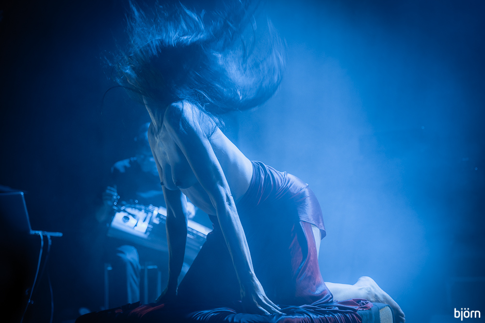 Nele hees zich, wit geschminkt (als een lijk?), gehuld in een rode doek, op een sokkel en bewoog op de dronende muziek van draailier en fluit. Een combinatie die het waarschijnlijk erg goed gedaan zou hebben in de Sint-Baafsabdij maar die toch wat aan impact verloor in de wat sterielere ruimte van een concertzaal. De onwennige blikken rondom ons, zeker eens duidelijk werd dat Nele met ontbloot bovenlijf voor het publiek stond, waren symptomatisch voor een zeker ongemak bij de toeschouwer. Het effect waar het trio op hoopte?