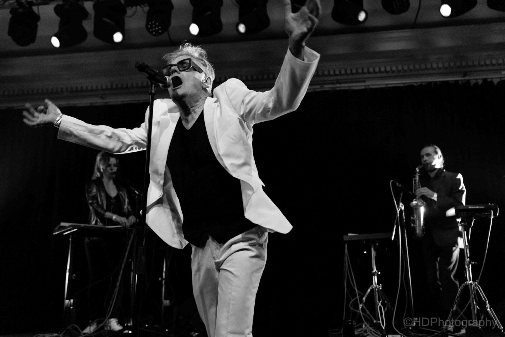 Wie stond er wel? Drie topmuzikanten: er was de gitarist Thomas Vanelslander (Gorki, Helsinki, RVHG) vergezeld door – op de saxofoon, aan de knoppen “en zoveel meer”, improviserend, imponerend – Andrew Claes (Stuff) en aan de toetsen en verantwoordelijk voor heerlijk typerende backing vocals “en zoveel meer”: Leen Diependaele (Samowar, History of New Wave Tour).