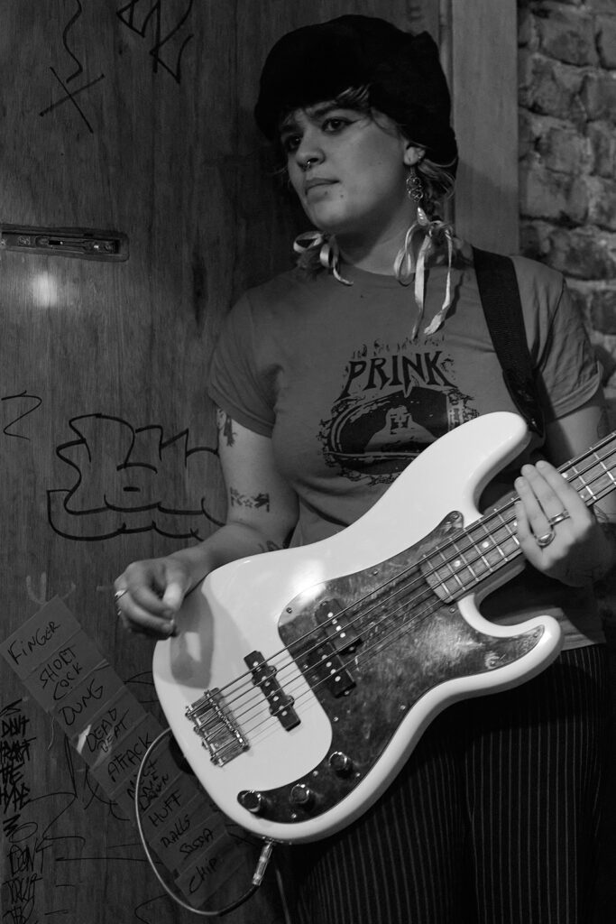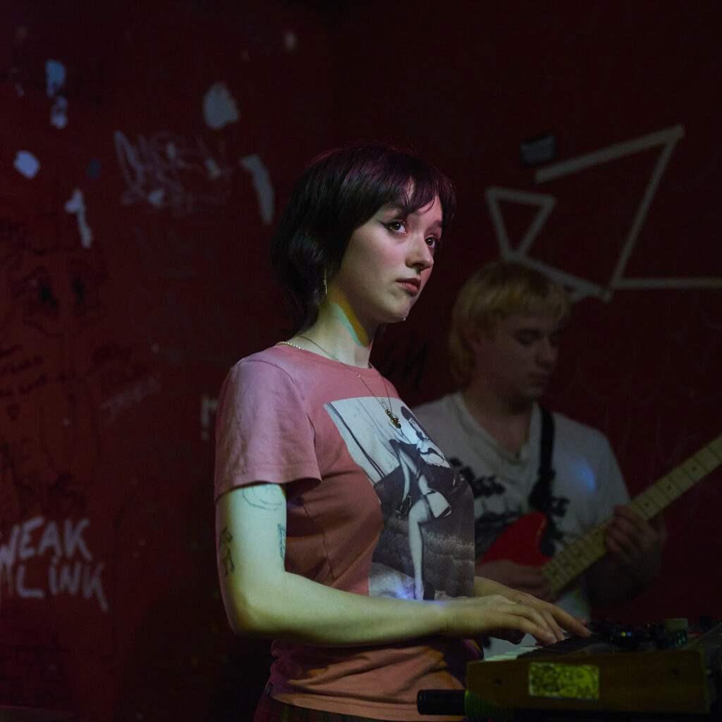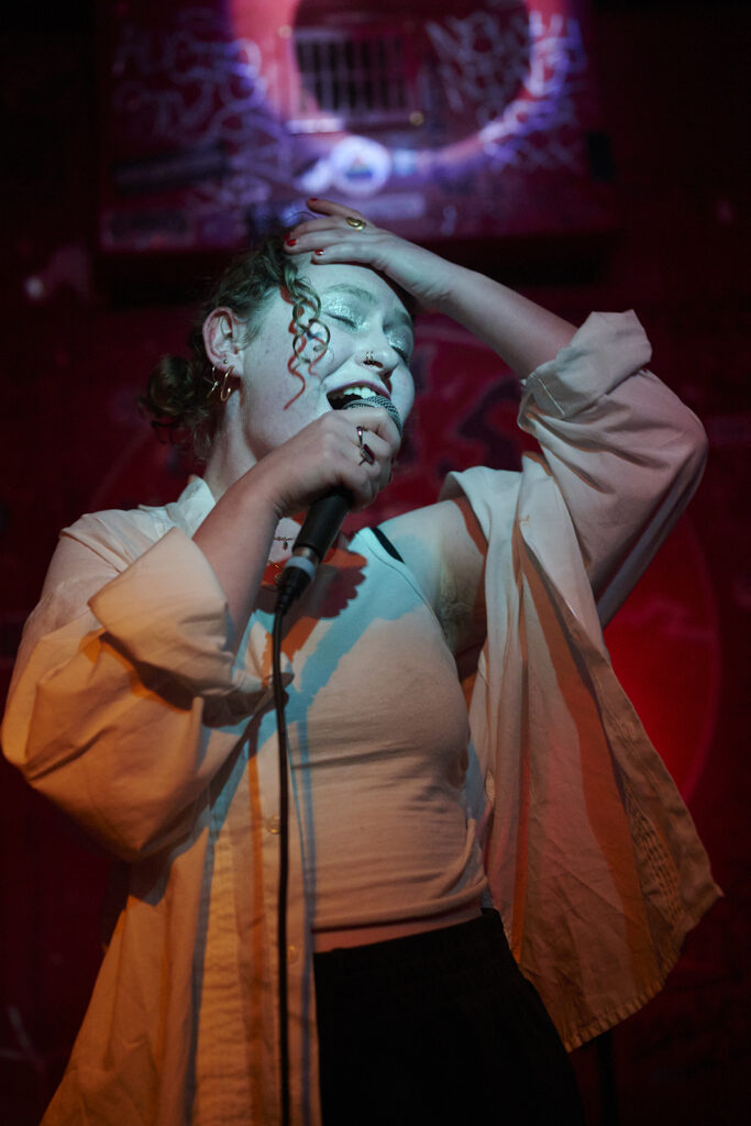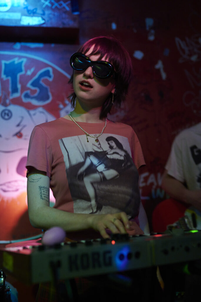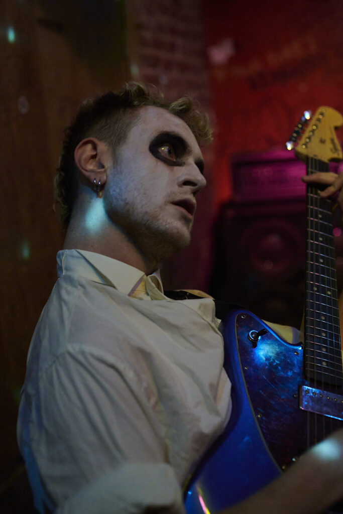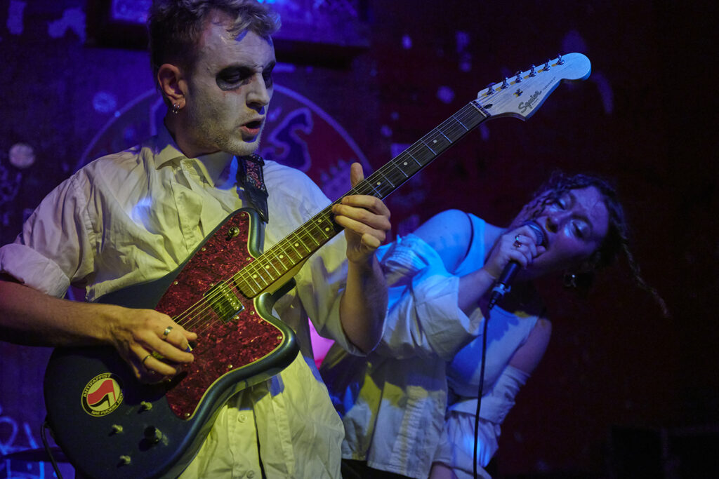 Maar eerst tijd voor Piss Rules uit Leuven. Eggman Meringuewell had wat tijd nodig om zijn smikkel wit te schilderen en zus Grandma’s Special wilde alvast beginnen maar moest eerst nog een pieske doen, alvorens ze hun set begonnen, die ons vanaf de eerste noten verbaasde en verraste. Zij wild aan het rondspringen en nonsensicale, grappige of naïeve teksten zingend en de toets van de cassettedeck (of drumcomputer, we konden het niet zo goed zien welk knopje ze nodig had) en Eggman die de wildste nowave-akkoorden uit zijn gitaar haalde, terwijl hij mee zong, het publiek nu en dan een vraag stelde (iemand die al eens karate deed, waarna een liedje over karate volgde als voorbeeld) en verder compleet uit zijn dak ging, waardoor hun set door het ruim aanwezige publiek heel erg werd gesmaakt.