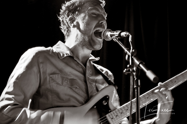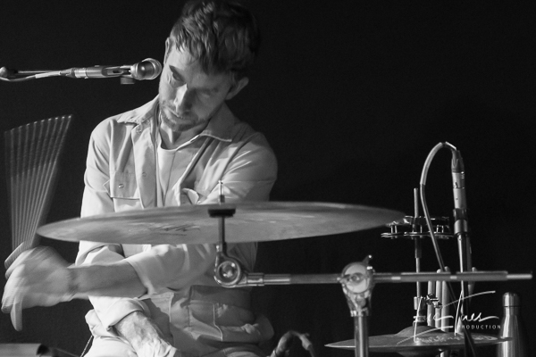 De band stond een beetje raar opgesteld daar in een hoekje van de foyer, zijdelings naar de zaal toe, en de leadzanger als drummer blijven we een raar gegeven vinden. Een drummer kan zich uiteraard wel geven, maar hij zit toch vast aan zijn drum. Geen heen en weer geloop om het publiek te entertainen dus.