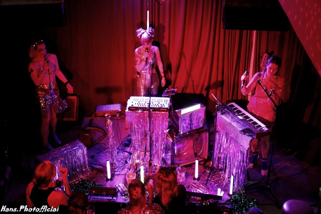 En of er gevlogen werd! Met de megafoon in de hand was Naomi orkestmeester voor de cursus meezingen voor durvers. Dit slotnummer van de ep was ook het moment waarop de drie heupwiegend een staaltje choreografie etaleerden. Nog meer gejoel was hun deel. We stelden ook vast dat Jana met scherp uit haar zeepbellenpistool schiet. Waarover de song gaat? Iedere vrouw in de zaal kent wel een man die alle zuurstof uit de vriendschap haalt door zich als een narcist en klootzak te gedragen. “We all know you’re a narcissistic asshole” werd uit alle dorstige kelen meegebruld. De beat in het slot neigde naar kermismuziek en een rupsbaan, maar we hadden genoeg ‘geruimtevaard’.