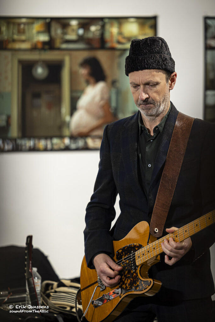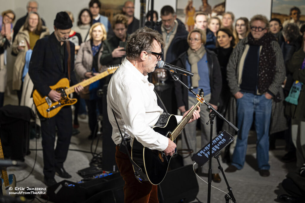 De bruut verlichte ruimte met warme accenten scheen op het tentoongestelde artwork en het op gelijkwaardige hoogte schuin opgestelde podium. Een geïmproviseerde ingerichte toog van Duvel Moortgat liet zijn rood gele kleuren mooi vermengen met het warme gelaat van de expositie, terwijl de muzikanten zich in een uithoek warm hielden achter gesloten gordijnen. We zagen een schijnbaar minder zenuwachtige Daan zich stuivend de gevraagde aandacht geven aan de talrijke zware brilmonturen die hand in hand gaan met deze vintage buurt.