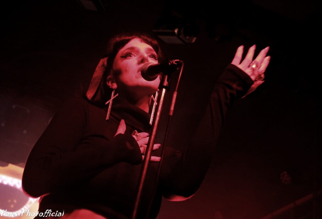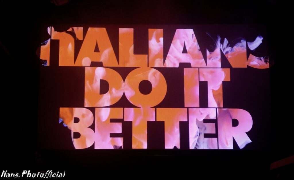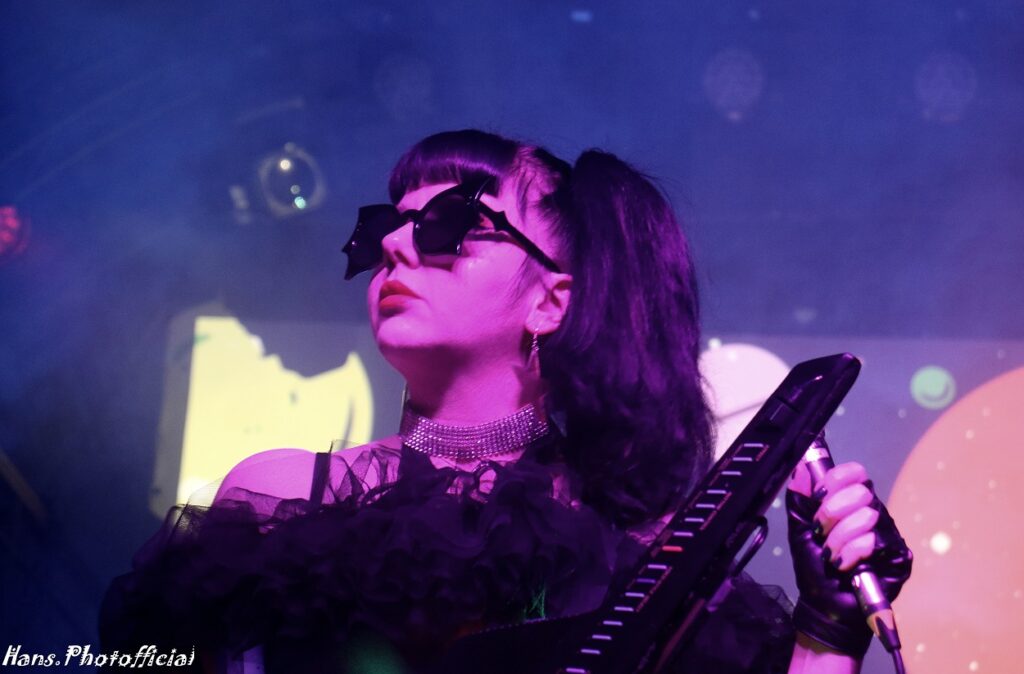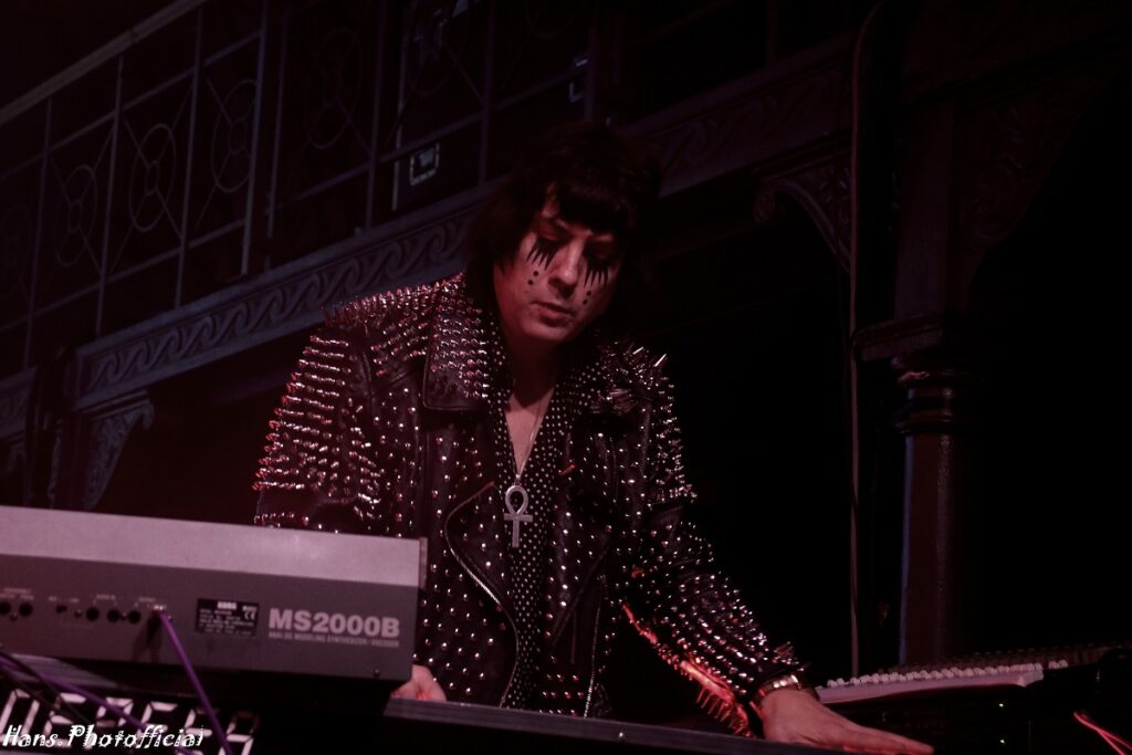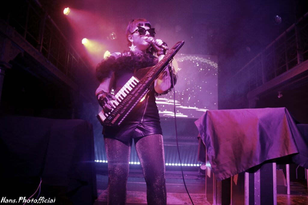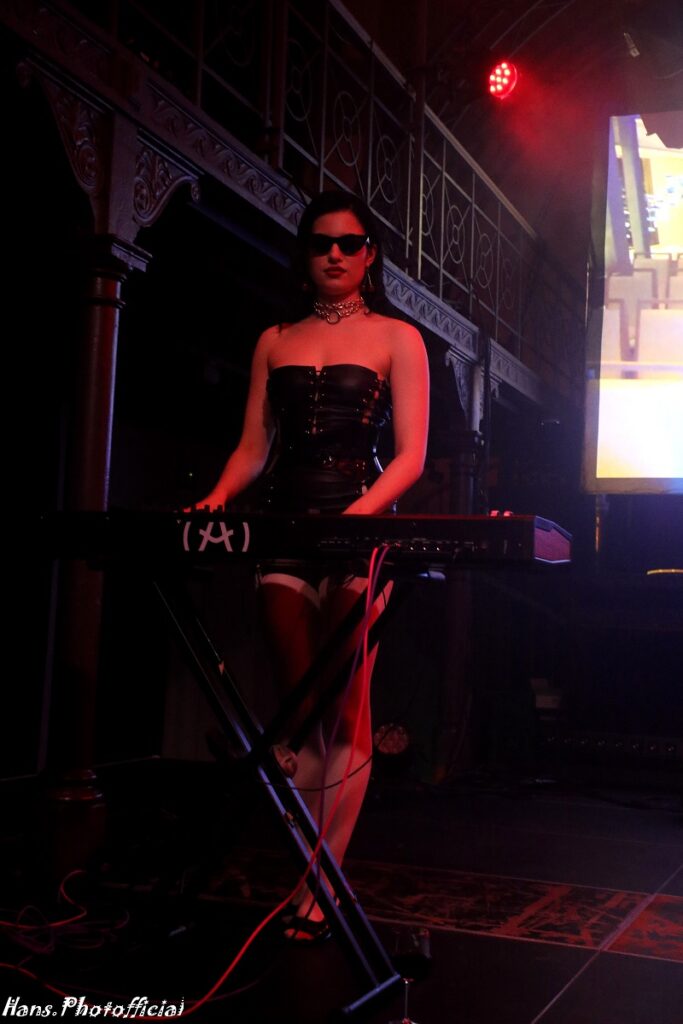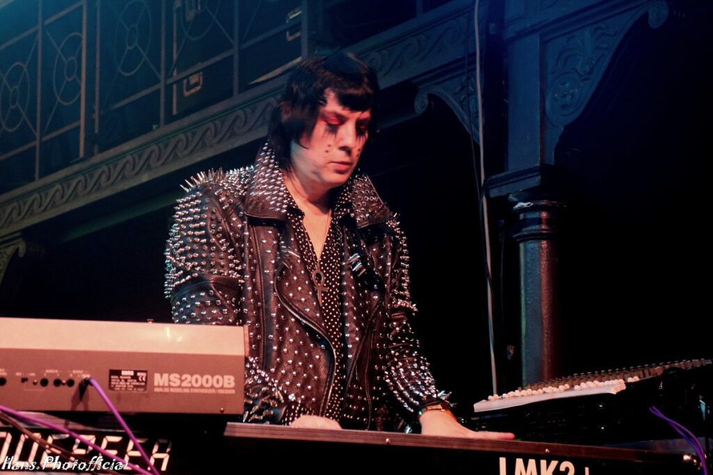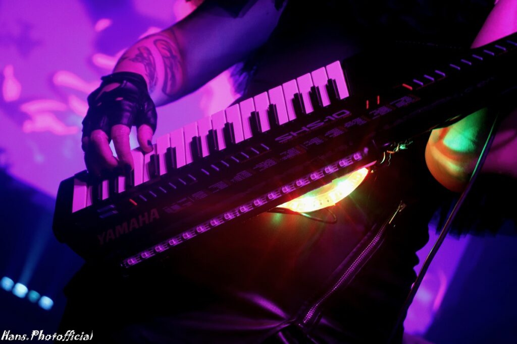 Geen kat of vleermuis maalde daar om want de sfeer en de nummers zijn bij de betere Italianen primordiaal en live instrumenten een futiliteit. Het tweede nummer dat ze op een steevast lijzige onderkoelde wijze, doch met hoge stem, zong was een cover van Kim Wilde’s Cambodia. Diep in de set werd de darksynth-groove feller uitgesneden en dat had een onweerstaanbaar effect op nummers als Let’s Feel The Pulse Of The Night en Cosmic Love. Onder impuls van de heerlijke animatie-backdrop, denk aan cartoons van mooie vrouwen met lange nagels, vormde Light Splash een fraai einde van wat we sowieso uiteindelijk vooral als een inleidend sfeerbeeld voor wat komen zou konden beschouwen. Orion leek ook gewoon vrede te nemen met haar status.