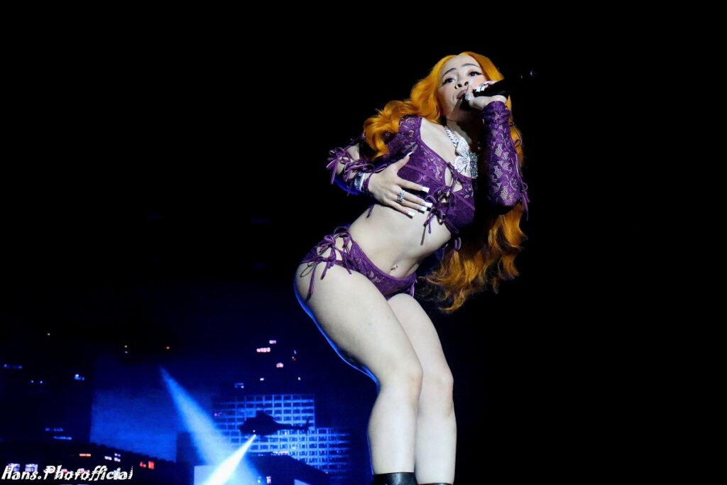 Ice Spice kwam als uit de hemel gezonden de fans begroeten in een felle zoekspot. Op de achtergrond werden helikopters geprojecteerd op de backdrop. Dansers in haar zog en een blitse combinatie tussen pickeloranje haar en fuchsia lingerie leverden een visueel totaalspektakel op dat haar optreden extra pigment bezorgde. Pigment en pikant, het lijkt wat op elkaar, en de klassieke rap clichés werden gretig bovengehaald. Je kent ze wel, de “big asses” en de “main bitches”. Los daarvan had het optreden muzikaal veel meer om het lijf dan het aantal gram textiel rond haar lichaam liet vermoeden. Isis is een begenadigde rapper en haar nummers staan er ook wel.