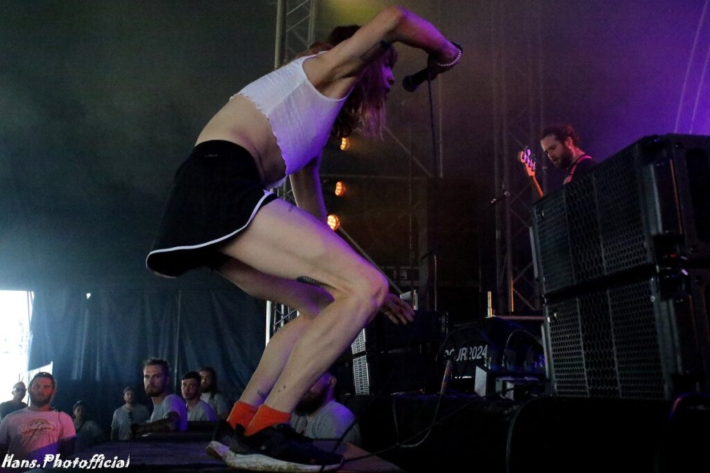 Op een bepaald moment klom Cal – zie aparte fotoreportage – op de lichtboog over het podium en dat gebeurde met een verrassende behendigheid. Ongevaarlijk kon je dit allesbehalve noemen. Zoals in het schitterende Ded Würst in het begin en I Am Kate Moss in de finale mixt de band een soort ingehouden spanningsveld met verstilde ritmesectie en fluisterzang met een ongemeen hard eruptief gitaargeweld en onderkoelde postpunk. Ditz was minder dwingend dan in het voorjaar als opener voor IDLES in de Lotto Arena. Francis sleurde hard aan de “all-in experience” maar collectieve gekte was hun deel deze keer niet, een beetje het euvel van alle ‘overdag’-bands op dag1 van Dour. Ofwel was het nog te warm ofwel was niemand al wakker genoeg. No Thanks, I’m Full was dan een beetje de symbolische afsluiter van een alweer gedenkwaardige passage van de gekke Britten.