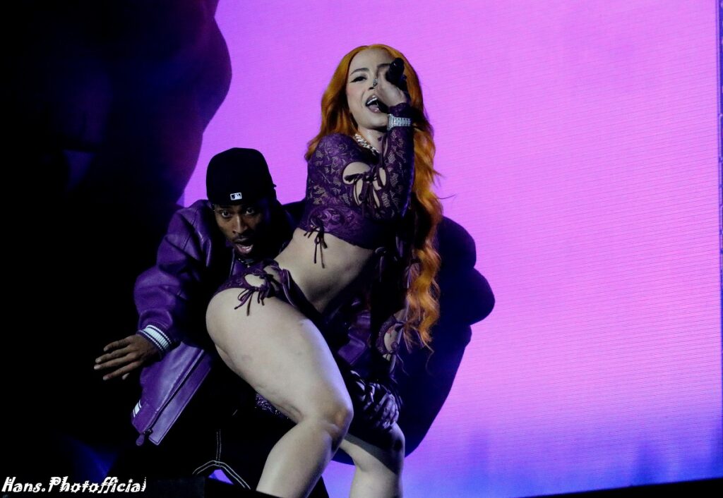 Ice Spice kwam als uit de hemel gezonden de fans begroeten in een felle zoekspot. Op de achtergrond werden helikopters geprojecteerd op de backdrop. Dansers in haar zog en een blitse combinatie tussen pickeloranje haar en fuchsia lingerie leverden een visueel totaalspektakel op dat haar optreden extra pigment bezorgde. Pigment en pikant, het lijkt wat op elkaar, en de klassieke rap clichés werden gretig bovengehaald. Je kent ze wel, de “big asses” en de “main bitches”. Los daarvan had het optreden muzikaal veel meer om het lijf dan het aantal gram textiel rond haar lichaam liet vermoeden. Isis is een begenadigde rapper en haar nummers staan er ook wel.