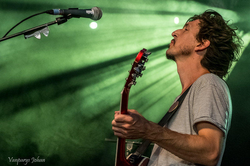Wat rust en verkoeling vonden we op het Buskerpodium met de band KEUN. Keun is in principe een soloproject maar hij had een bijkomende muzikant die zich voorstelde als kenner van speciale instrumenten. Vandaag had hij een harmonium mee – (een orgel met een pomp) en een bizouki (een gitaarachtig instrument dat om goed te klinken eigenlijk vals moet worden afgesteld). Met die instrumenten en de gitaar van Keun zelf, brachten ze een soort lo-fi folk. Keun zingt werkelijk wondermooi. Zijn woorden dansen als een waterschaatser over de muziekgolven. Dit werd gesmaakt want niemand maakte aanstalten om de volgende act op het officiële programma te gaan bekijken. Het was Keun zelf die er ons attent op maakte dat Lenny en de Wespen al was gestart. “Als je hem straks ziet, zeg hem dat ik straks met hem meerijdt”, riep hij.