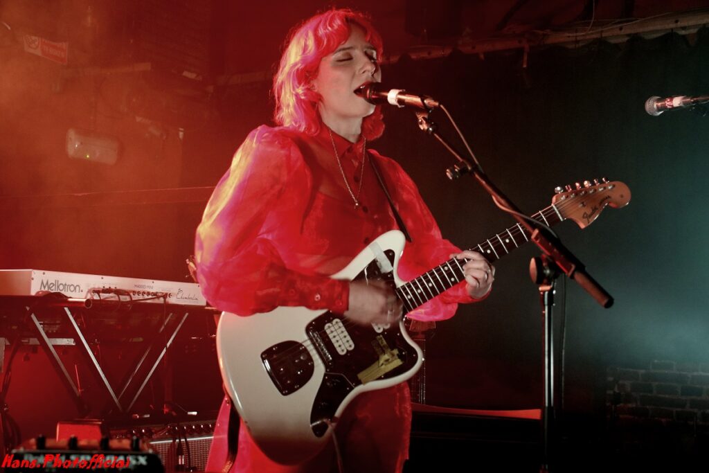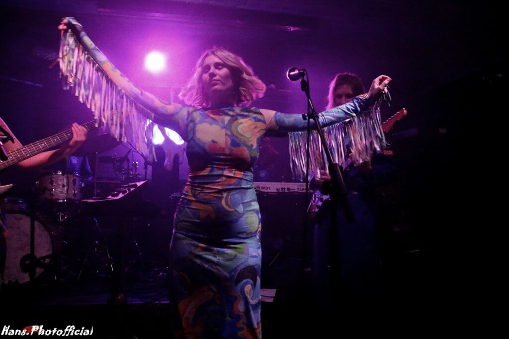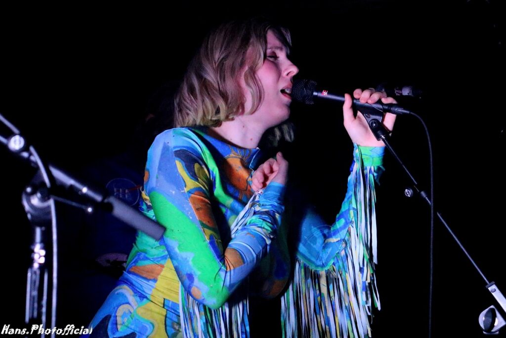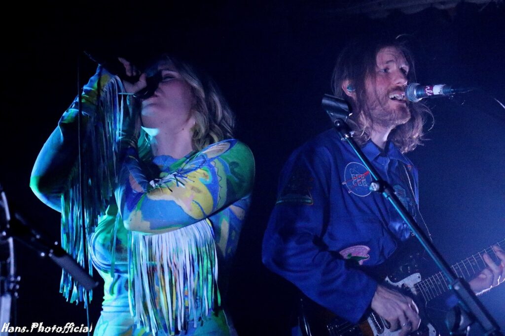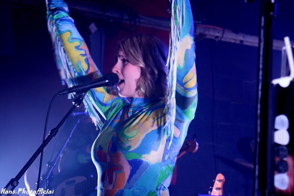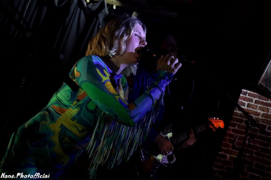 Het contrast met de podiumopstelling bij het Deense Eee Gee kon nauwelijks groter zijn. Een 5-piece verscheen op het al niet grote podium en zeker zangeres Emma Grankvist en haar bassiste vielen meteen fel op in een turquoisekleurige strakke outfit. De 3 mannen uit de band waarvan gitarist Simon jarig was, droegen een soort Back To The Future-achtig ruimtepak. Eee Gee is eigenlijk het eenmansproject van de 31-jarige Grankvist die muziek met de paplepel meekreeg. Haar vader maakt(e) gitaren en haar moeder speelde en zong nog op Roskilde. In 2019 had ze nog een electropopduo Young Tiger. Hoewel het duo behoorlijk succesvol was, koos Grankvist ervoor om haar solo ambities te verzilveren.