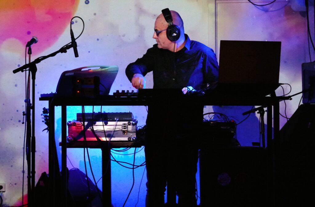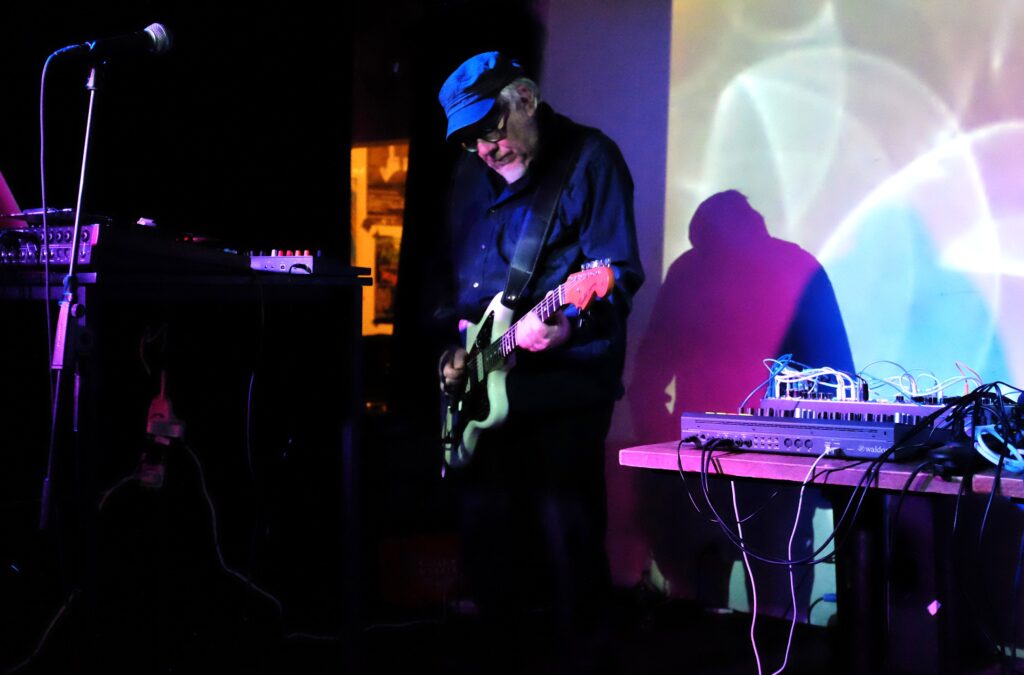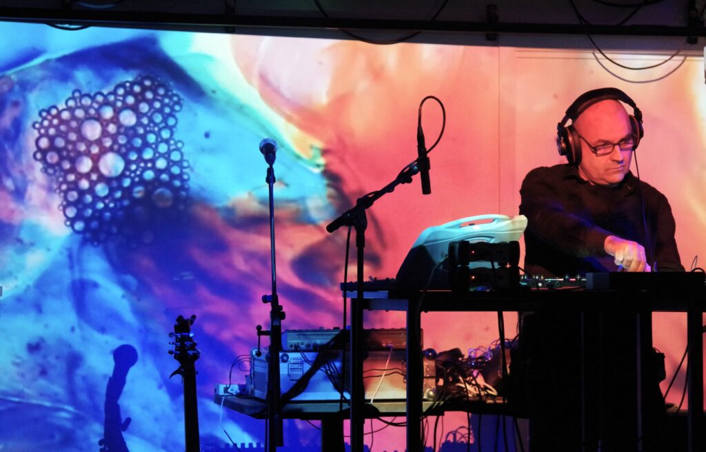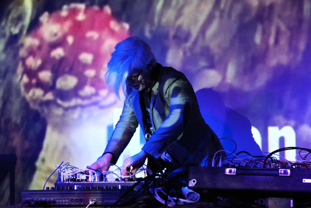 Na het technische probleem van Sebastopol kwamen de zenuwen van de tweede act van de avond in een hoger spanningsveld. Nevel is het kindje van Bart Van Meulebroeck die in 2019 de mooie dubbele cd Hageland op het vergane Wool-E-Discs uitbracht. Dat we bij Nevel in een soort The Orb-sfeertje zouden belanden werd al na enkele seconden duidelijk met de intro sample van The Orbs klassieker Little Fluffy Clouds. Van Meulebroeck werkte zich in het zweet met een zeer gevarieerde set waarbij verschillende elektronische muziekstijlen door elkaar gegooid werden. We genoten van een vlechtwerk met groovy down tempo, kosmische ambient en Berlijnse School waarbij heel wat experimentele fragmenten toegevoegd werden. Nevel onderbrak zijn set om wat toewijding te geven over het gebruik van een stemsample van Luc De Vos (Gorki), een pianosample van Pieter Vermeyen en het gesproken stukje van John Cage over het waarnemen van muziek en omgevingsgeluiden. De niet te versmaden muziek van Nevel werd vergezeld van prachtige achtergrondbeelden, Van Meulebroeck werd bijna verzwolgen door de kleurrijke psychedelische creaties van Ed’s Amazing Liquid Light. Het geslaagde optreden triggerde des te meer onze nieuwsgierigheid naar het nieuwe werk van Nevel, dat ergens dit voorjaar uitgebracht wordt.