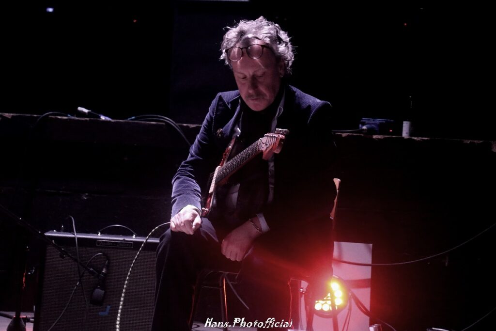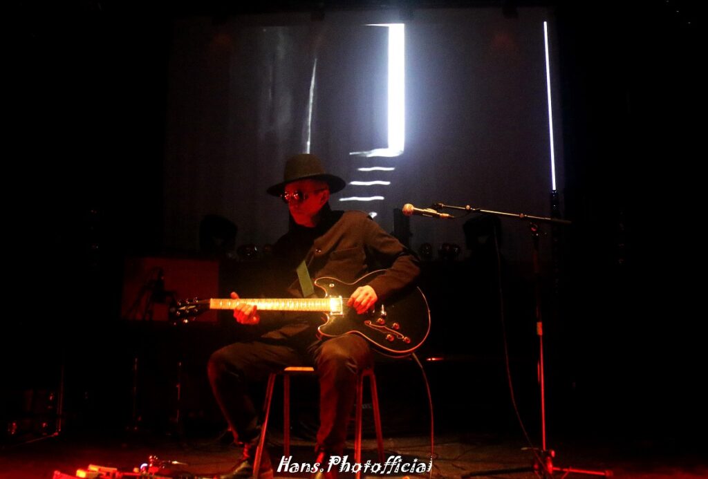 Ook Marc De Backer kwam langs. De Brusselse gitarist van onder meer Wolvennest deed in geen geval licht in de duisternis schijnen. Marc, een zittende gitarist met onafscheidelijke zonnebril en hoed, bracht redelijk bevlogen puur instrumentale gitaarsongs die veel warmer klonken dan op voorhand verwacht. Er sloop veel noise in de met blues verzwaarde nummers en dan kom je al gauw bij Thurston Moore uit als ijkpunt. De pedalentrein aan zijn voeten kreeg natuurlijk veel werk waardoor het geheel een vrijblijvend karakter moeiteloos oversteeg. De hoed en zonnebril vormden in deze met kampvuursfeer opgesmukte setting een perfect outbackdecor. Op het eind werd de gitaar ‘gemetaliseerd’ en werd de wolf in zijn nest gelegd. De Backer manifesteerde zich al eerder als begenadigd gitarist maar op zijn eentje maakte hij grote sier.