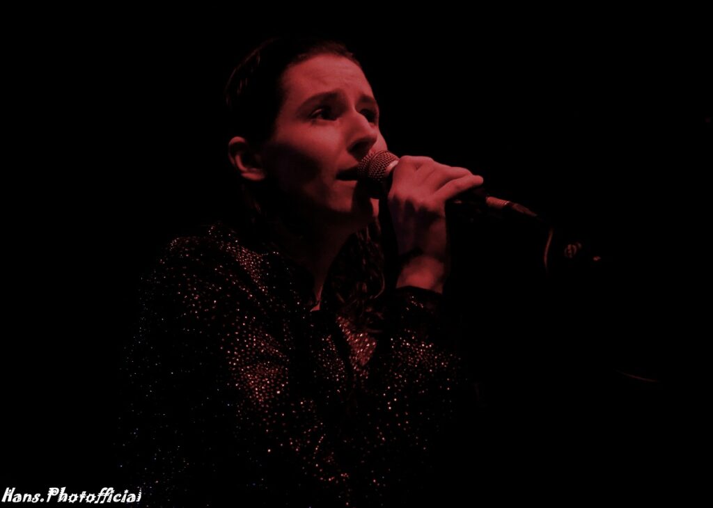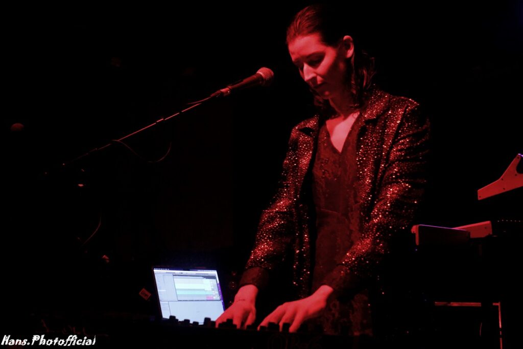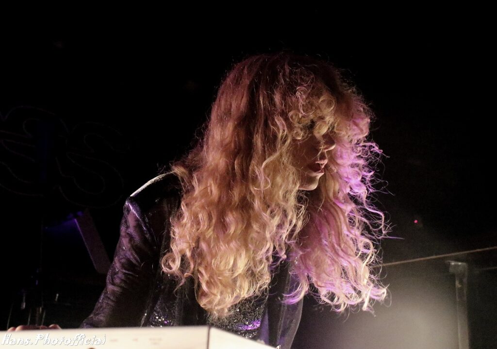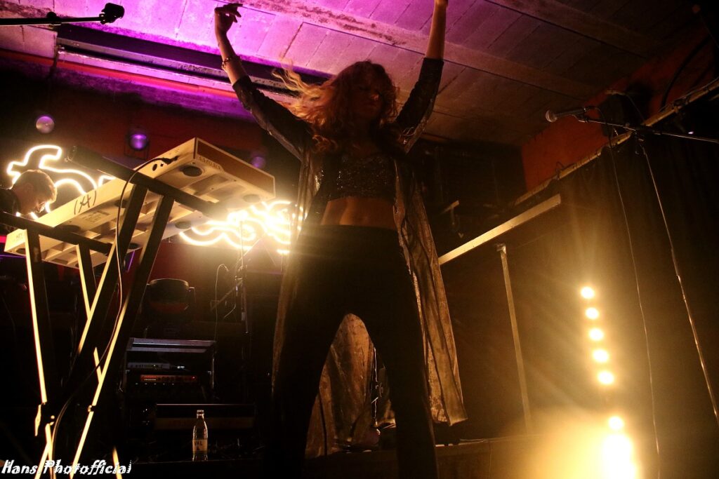 Want inderdaad, Joppe Vanwetswinkel en Nils Tijtgat namen hun positie in op de zolderverdieping van het podium en Hanne mocht de kelder als catwalk aflopen. De eerste van drie ep-release shows kon eindelijk plaatsvinden. Het verwachte openingsduo Intro / Alive liet Hanne vooral achter de keyboards al headbangend plaatsnemen want veel zang was in deze openingsfase niet voorzien. De knappe neon-verlichting met de naam van de band en de minutieus afgestelde stroboscooppaaltjes deden ons meteen de bedenking maken of we ooit al een betere sound and vision hebben zien passeren in de Charlatan. Sfeervol, feestelijk en heerlijk om naar te kijken. Het was het perfecte kader om Hanne aan het dansen te krijgen zoals in Need Your Love. Haar outfitkeuze was weer onberispelijk elegant, zwierig en sexy.