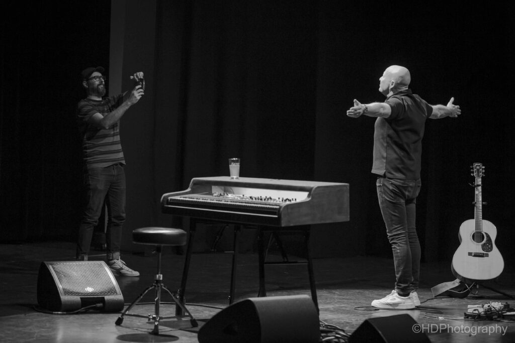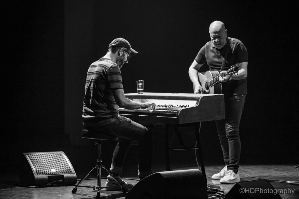 Na enkele nummers verscheen David Poltrock op het podium, klaar om Frank Vander Linden en zijn gitaar met keyboard te ondersteunen bij nog wat liedjes van De Mens met onder meer Genees Mij en Jeroen Brouwers (Schrijft Een Boek). Nummer na nummer volgden mekaar op, nog steeds met de nodige (en geslaagde) humor. De tijd vloog voorbij, het publiek genoot zichtbaar en was helemaal mee in het verhaal. De dynamiek tussen de zanger en David Poltrock voelde perfect, zo wonderwel op mekaar afgestemd dat we alleen maar in verwondering konden toekijken. Kim Is Dood, Ben Je Een Autodief Of Breng Je Me Naar Huis, Je Kwetst Me Want Je Bent Van Mij, Het Is Maar Verdriet,…