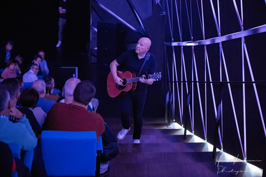 Hij sluit zijn set af zoals hij die begon: als een troubadour in de zaal, tussen de mensen.