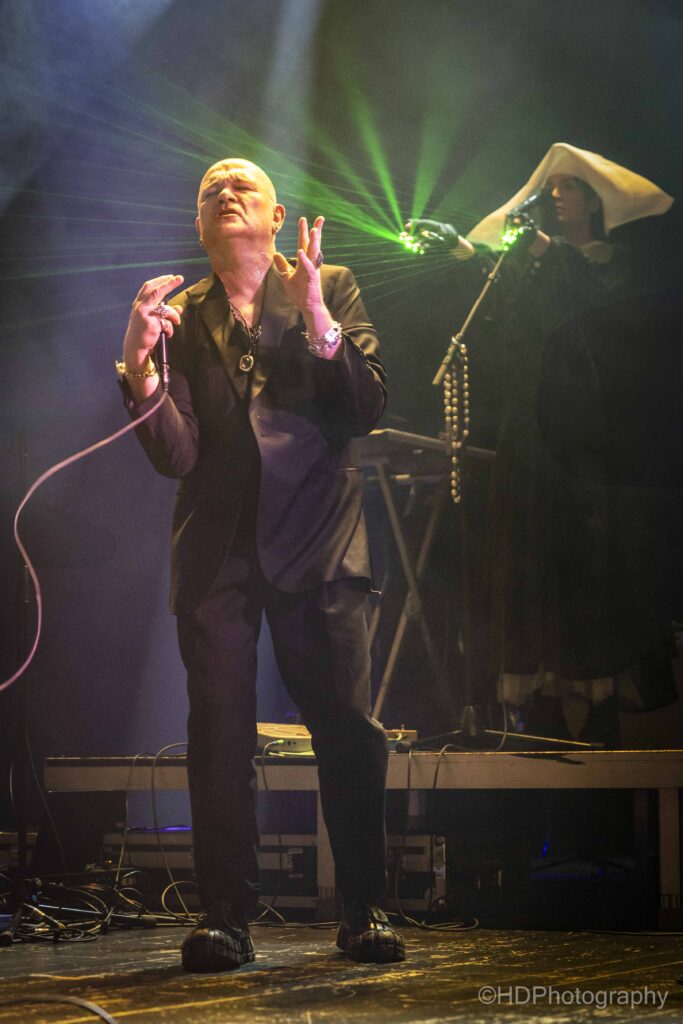 Voordat de show echt van start ging, kregen we eerst een stukje uit Miserere van Gregorio Allegri door The Tallis Scholars wat onmiddellijk een dramatische sfeer creëerde in de zaal. De perfecte setting dus voor het typisch theatrale aspect van Gavin Friday. Friday bracht Renaud Pion mee naar Gent die hem heel knap begeleidde op verschillende blaasinstrumenten. Zangeres, keyboardspeler en gitariste Carly Carlsbad zorgde op haar beurt voor meerdere kledingwisselingen waaronder zelfs een nonnenkleed terwijl Kevin Cocoran alles aanvulde bas, elektrische gitaar en synths. Gavin stond op het podium met op het hoofd hoofd glitters wat een kitscherig randje gaf aan de performance. In de wereld van Friday zijn drama, cabaret en theater dan ook evidentie.