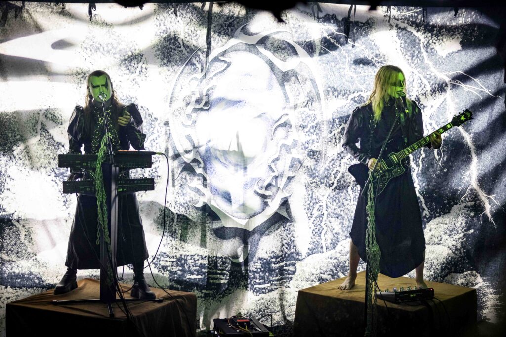 Stipt om 19 uur namen Adam en Jordan, het Britse synth-rock duo Zetra, elk op een houten blok hun plaats in. Gekleed in zwarte, gotische gewaden, wit en zwart geschminkt gezicht, getooid ook met kettingen en andere rekwisieten.