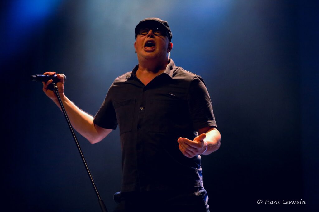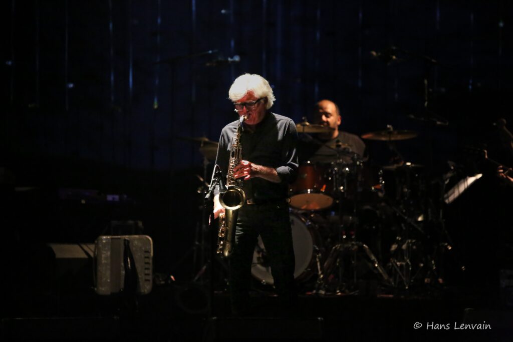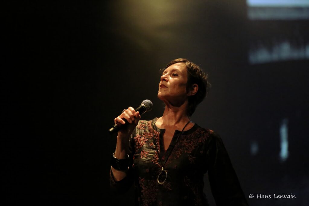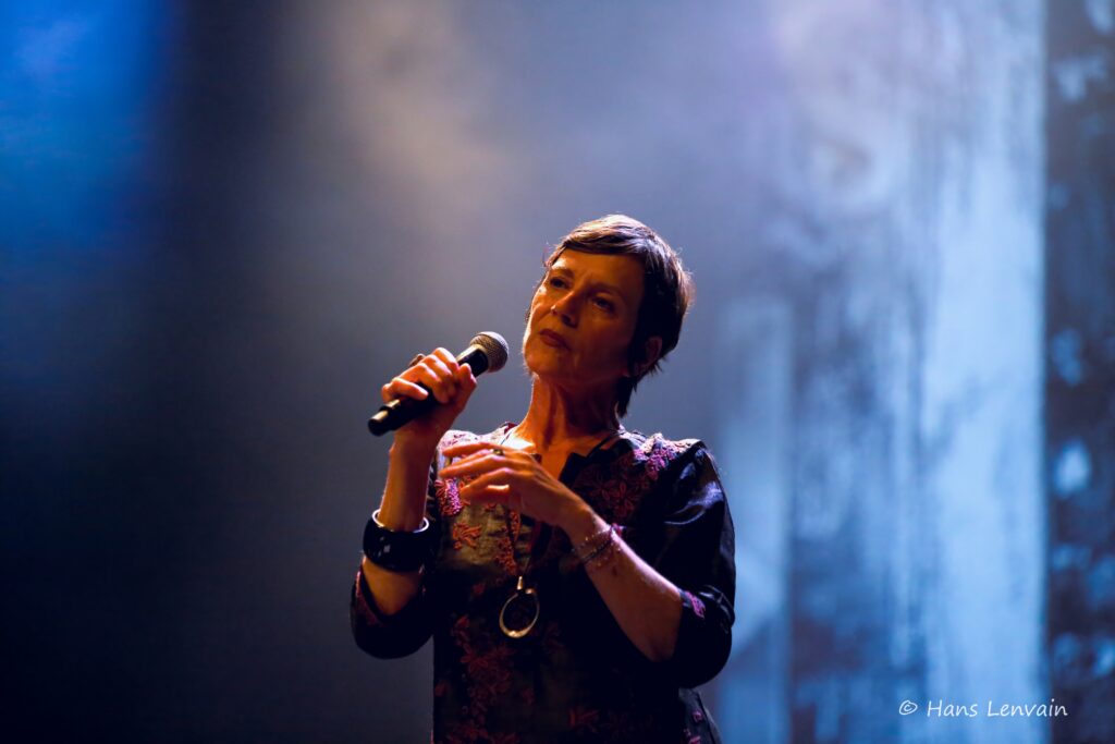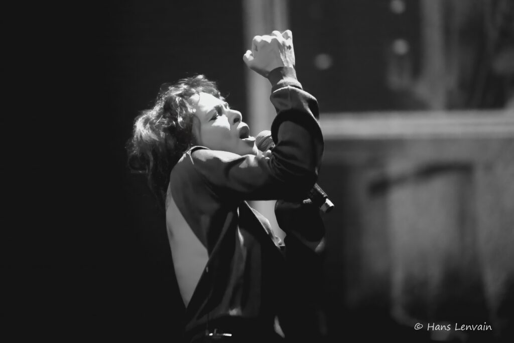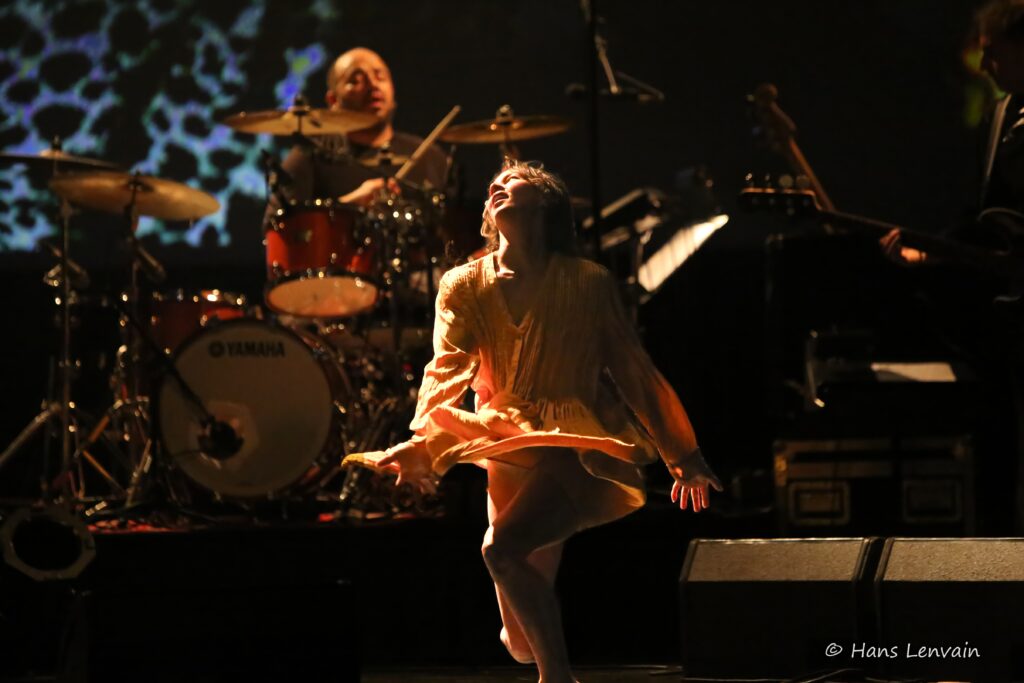 Vervolgens was Melanie De Biasio aan de beurt met het nummer Elle Adore Le Noir. Il faut le faire… Zo mooi en gevoelig gebracht. Intiem ook, mede door de speciale verlichting. Als in blauwe achtergrond en één rode lamp die uit het plafond naar beneden zeeg tot net boven haar hoofd. Alweer lastig voor de fotografen maar o zo mooi. Twee micro’s in de hand, eentje op statief en eentje los. Die tweede micro los in de hand deed dienst op het moment dat ze haar statief verliet en helemaal opging in het nummer. Pure klasse.