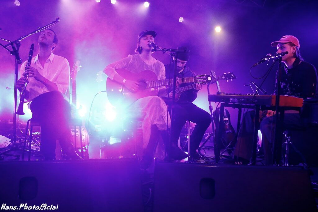 Er kwam een voorprogramma uit Antwerpen afgereisd met de leuke bandnaam I’m The Hug. En óf ze knuffelbaar waren. I’m The Hug is Mathilde Luijten (zang), Abel Ghekiere (gitaar en klarinet), Simon Mitxelena (drums) en Orlan Ghekiere (synths). We kenden ze niet en hadden indiepop in gedachten maar werden verrast door een rustgevende indiepopsound met vleugjes jazz. Mathilde en Orlan beschermden zich met een petje tegen de spots en drummer Simon was goed gemutst. Nog vóór het goed en wel begonnen was liet Abel zijn klarinet vallen, met bijna verstrekkende gevolgen. We houden de milde spanning er nog even in. Ze zoeken het doorgaans niet al te ver. Zo heet hun in december uitgebrachte debuut ep Four Songs, en dat is juist geteld.