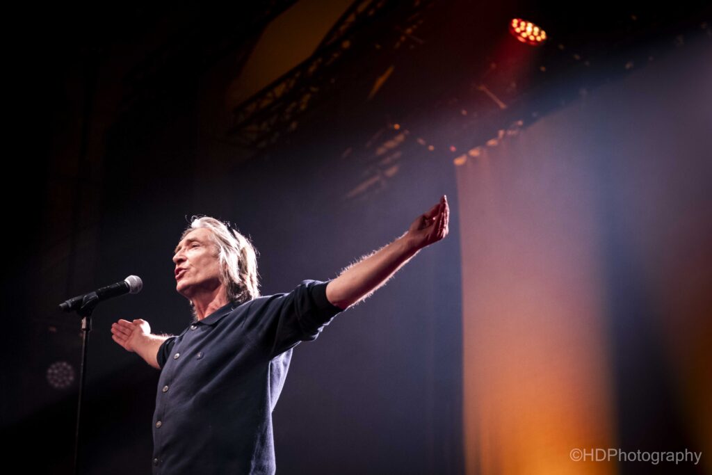 De huidige tour draait om zijn nieuwe dichtbundel getiteld What, (waarvan de cover ook de backdrop bleek te zijn). Terloops liet JCC ons weten dat het boek verkrijgbaar is in de gebruikelijke boekenwinkels. Hier dus geen merchandise, geen voorraadje mee om ter plaatse te verkopen (dit in tegenstelling tot Mike Garry, die zijn waar in de lobby zou verkopen).