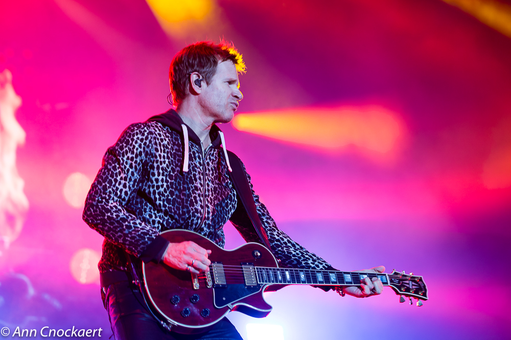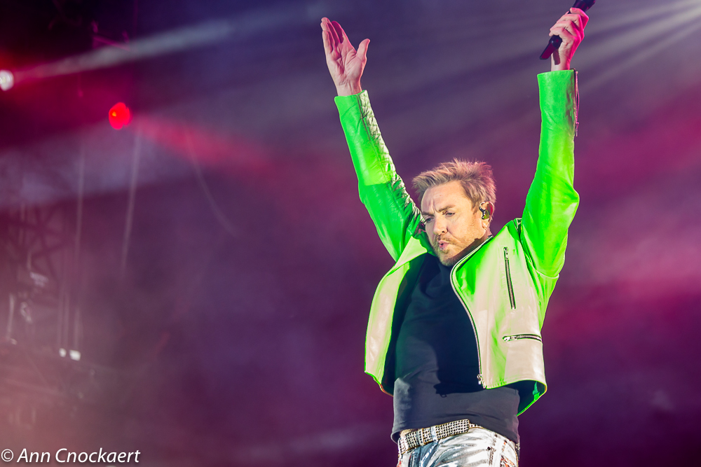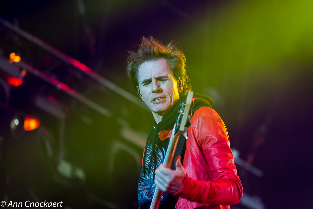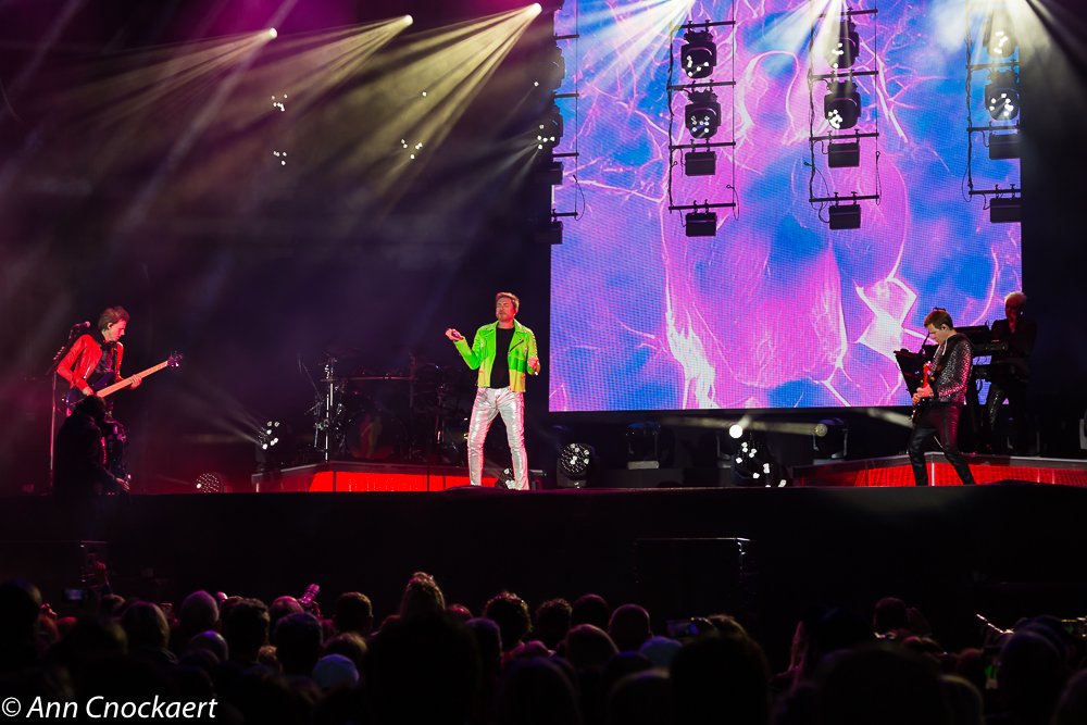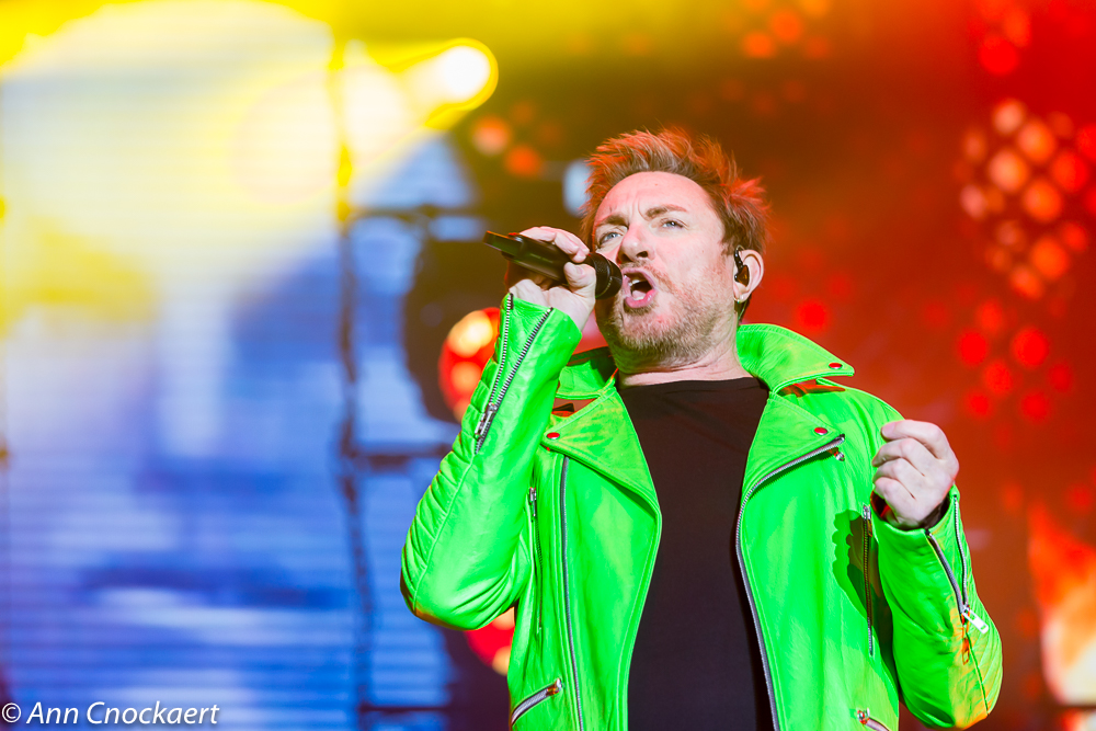 Badend in groen licht en met de intro van Velvet Newton kwam Duran Duran het podium op om meteen deze mythische tekst in te zetten: “Wild boys fallen far from glory, reckless and so hungered”. Wild Boys past ook ritmisch uitstekend bij het 37 jaar jongere Invisible, funky en op de drums voortbordurend. Een gezonde mix van eightieskrakers en recenter materiaal bleef voor een heerlijk meanderend tempo en feestgedruis zorgen. Het trio View To A Kill / Notorious / Union Of The Snake werd luidkeels meegebruld, niet dat Le Bon versterking nodig had want wat is die kerel nog goed bij stem zeg, heel imponerend. Come Undone is ongetwijfeld voer voor ‘die hard durannies’ en de band besefte ook dat ze met snelle reflexen setlistverval moesten voorkomen. The Reflex dus. Flex flex flex flex flex !!!!! Hier kon saxofonist Simon Willescroft zich voor het eerst perfect uitleven. Het stratenoude Friends Of Mine was een heerlijk tussendoortje wat het optreden echt wel lekker kruidde.