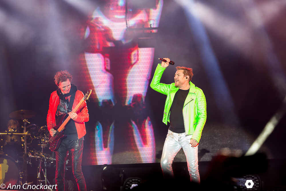 Best opvallend ook dat de line-up ook bijna intact is gebleven. Enkel Andy Taylor is al ruim 15 jaar weg en wordt live steevast vervangen door Dom Brown. De stuwende en ultra belangrijke krachten in de achtergrond, toetsenist Nick Rhodes en drummer Roger Taylor (geen familie) blijven de typerende maar verbluffend strak gebrachte eighties sound moeiteloos oproepen. De wondermooie achtergrondzangeressen Anna Ross en The Voice UK vedette Rachael O’Connor mochten vaak duelleren op de eerste rij met de grote boegbeelden die ook in Zeebrugge nog alle vrouwenharten sneller deden slaan. Bassist John Taylor (ik herhaal, geen familie) en zanger/eighties tieneridool Simon Le Bon staan er nog als waardige pophelden. De massahysterie van weleer is er niet meer, maar dat is de evidentie zelve.