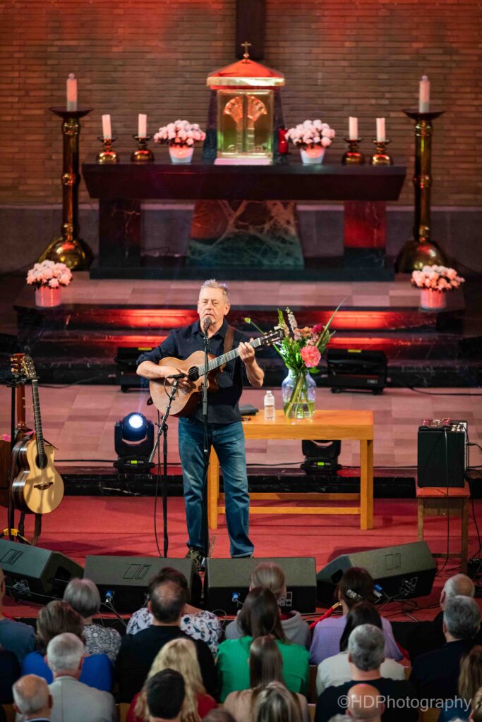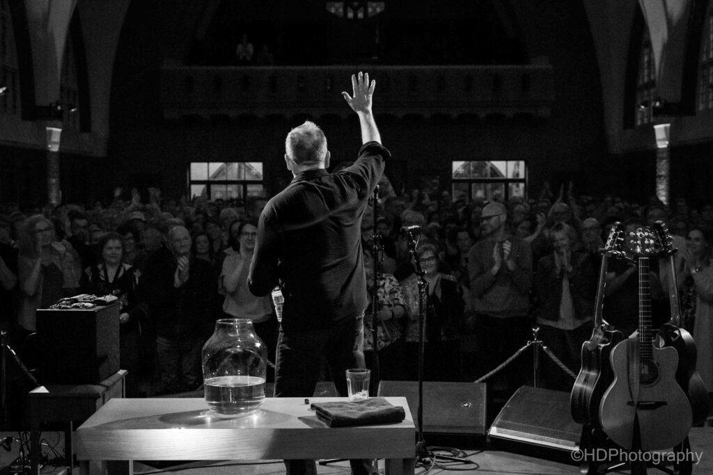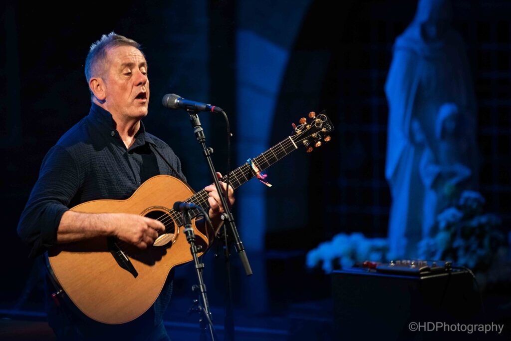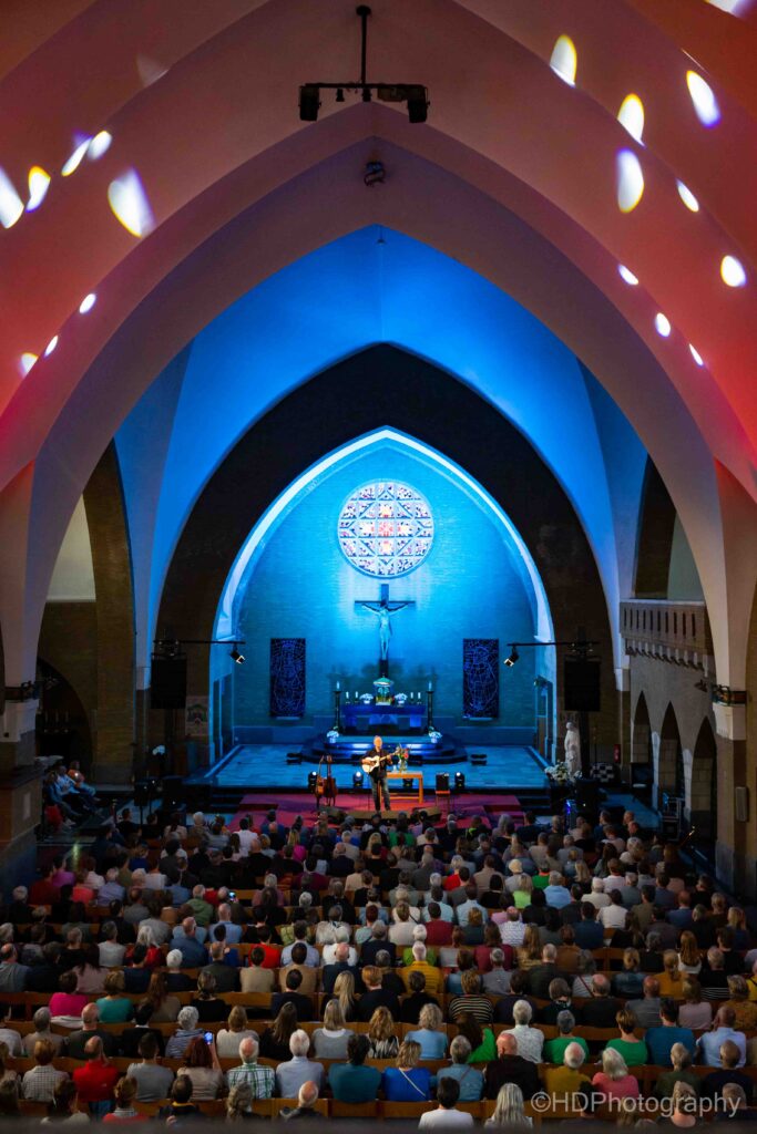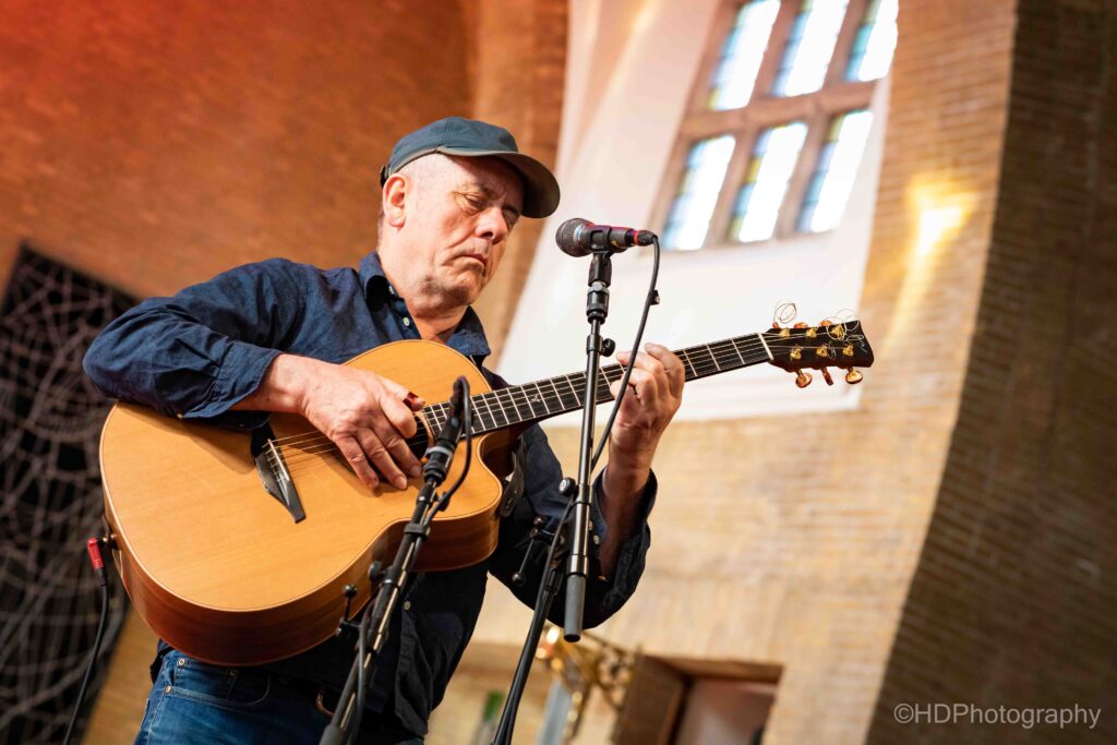 s’Avonds liep de uitverkochte kerk snel helemaal vol, met een ietwat ouder en rijper publiek. ‘You’re a good looking audience’, declameerde hij bij het opkomen. Ook refereerde hij naar het grote aantal kaalkoppen in de zaal en de toon was gezet. De set werd overtuigend ingezet met Diamond Mountain.
