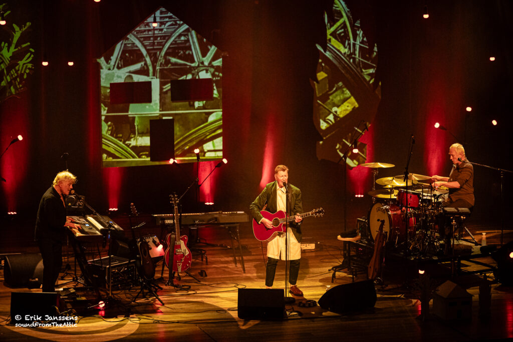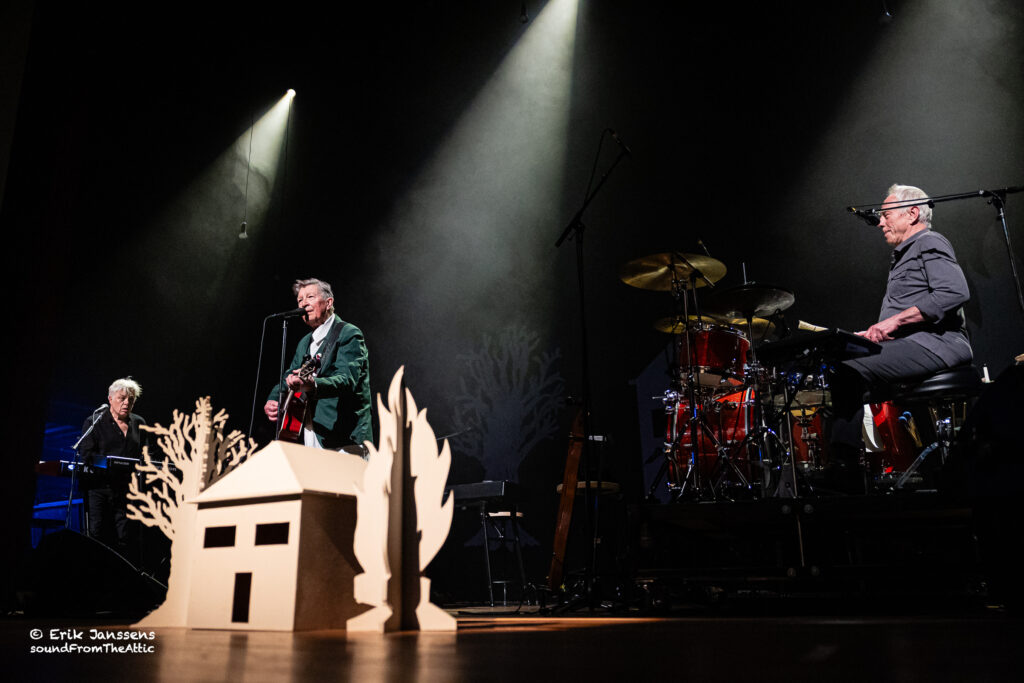 Henk vertelde het verhaal van hun afgebrande studio waarbij al hun instrumenten en memorabilia in de vlammen opgingen. Dit drama, gesymboliseerd door het witte huisje met boom en vlam vooraan op het podium, inspireerde hen om een aantal nieuwe nummer te schrijven die tijdens set passeerden. De achtergrond van het podium werd gebruikt om teksten en foto’s te projecteren op uitgesneden silhouetten van een boom, huis en vlam.