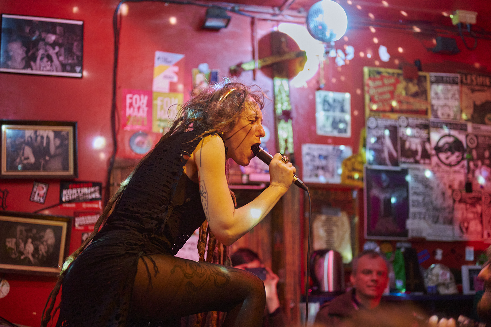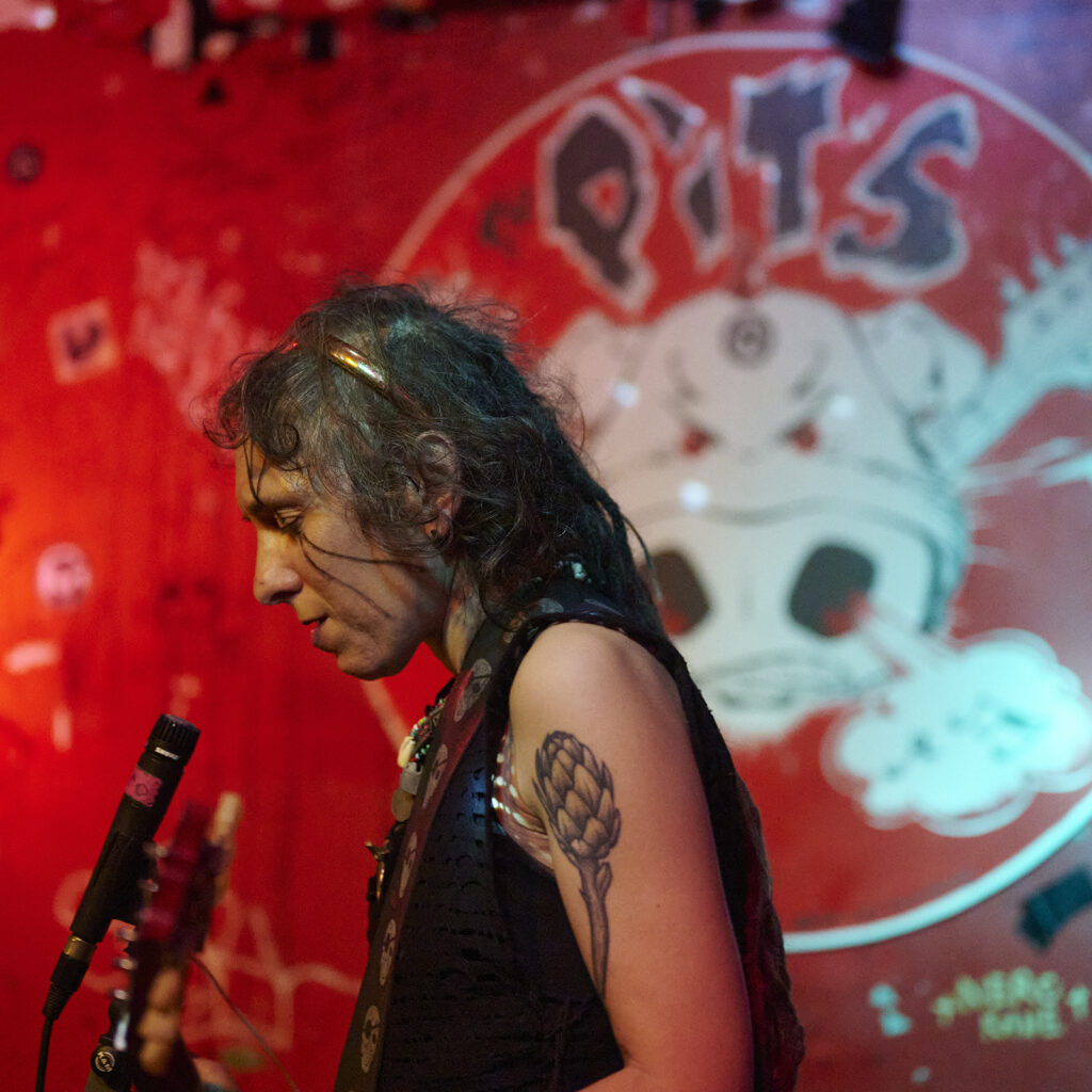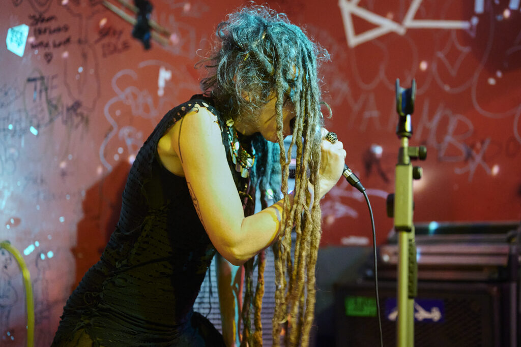 Pedretti, die op haar heel persoonlijke manier haar teksten declameert / schreeuwt / zingt / fluistert, niet met iemand anders te vergelijken eigenlijk, besloot halfweg op de toog te klimmen om haar excorcisme nog een extra indrukwekkend tintje mee te geven, zwaaiend met haar uitermate lange dreadlocks.