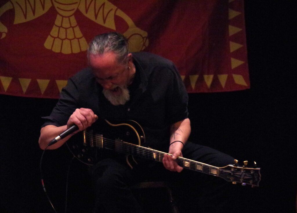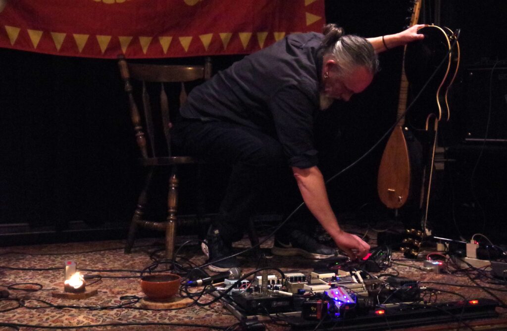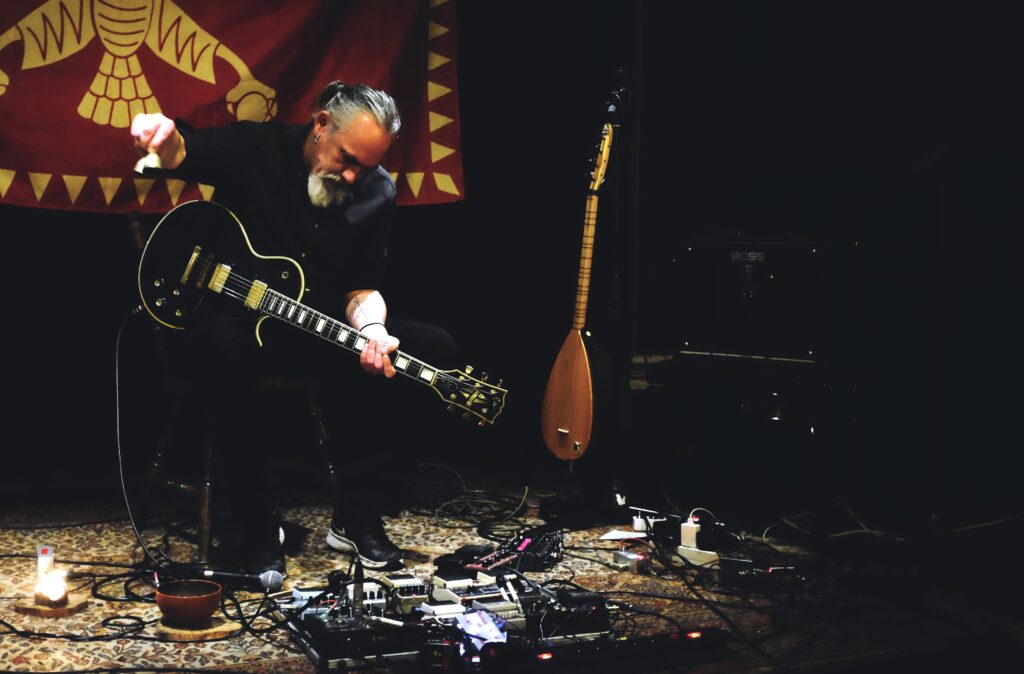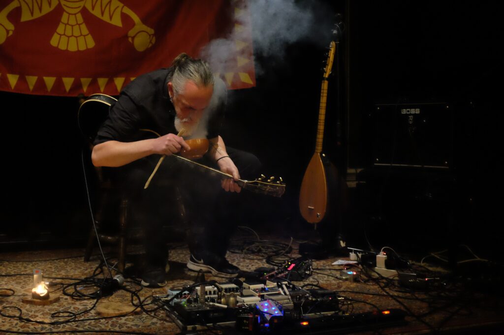 Onze eigen opper-sjamaan Peter Verwimp komt sinds de Covid-perikelen onder de noemer Ashtoreth niet zo vaak meer uit zijn kot. De Roots & Rituals-organisatie wist Verwimp echter terug naar Antwerpen te lokken voor een sublieme set. Ashtoreth was in bloedvorm en vlocht de ene na de andere gitaarloop aan elkaar, waarmee hij zijn transcendente geluidswolken tot leven bracht. Met diverse hulpmiddelen, zoals verschillende (snaar)vibrators, manipuleerde hij de snaren tot een bad van intense en rituele resonanties. Een beetje vuur en wierook hoorden er natuurlijk ook traditioneel bij om de rituele sfeer te versterken. Verwimp voegde, naast zijn sjamanistische vocalen, ook enkele verrassend friemelende gitaarmelodieën en subtiele belletjes toe aan zijn loops. De schitterende gedeeltelijke improvisatie set bereikte een onverwacht hoogtepunt met een eruptie van gitaarnoise die de trommelvliezen ongetwijfeld enkele krasjes bezorgde. Eén ding is zeker: Ashtoreth kan het nog steeds en, net als oude wijn, wordt hij met de tijd alleen maar beter.