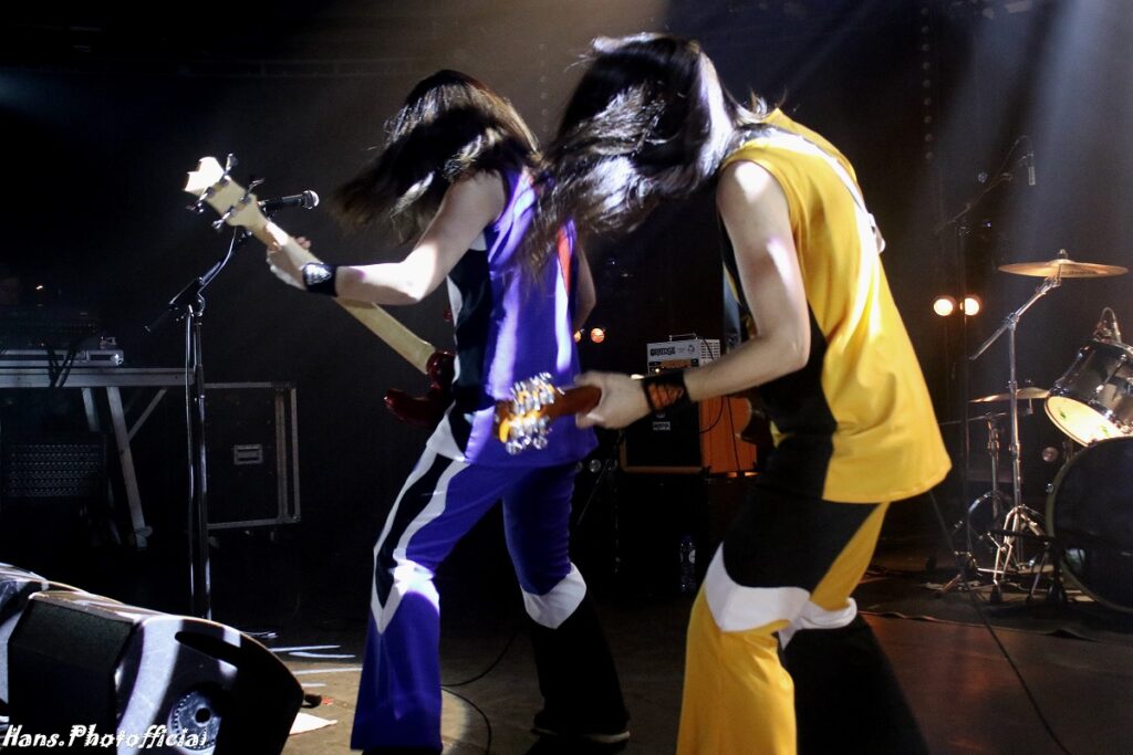 “Good evening Brussels Rock City, we are Shonen Knife from Osaka!” Konnichiwa was meteen de logische opener van een redelijk briljant optreden van de oude knarren die menig jong veulen serieus op hun plaats hebben gezet in een goedgevulde Rotonde. Een blik op de nummers die volgden geeft veel prijs over de inhoud van de teksten. Of wat had je gedacht van pakweg Banana Chips, Bear Up Bison, Jump Into The World en Green Tea? Shonen Knife speelde inderdaad vurige rocksongs met een stevige punkknipoog en de teksten gaan effectief over onderwerpen waarmee zij bezig zijn en die hen vrolijk stemmen. Koekjes, sushi, snoepgoed. Kortom: voedsel voedt hun hersenen. Atsuko en Naoko haalden meteen alle clichés uit de punkkast zoals simultaan headbangen, ruggelings stoer gitaar spelen en de steeds weerkerende hilarische Beavis & Butthead-groet. Waar een andere band hier nooit mee zou wegkomen, gaf het net een pittig en schattig karakter aan het concert. Pittig en schattig zijn nauwelijks te combineren woorden die nochtans vrij accuraat de lading dekken.