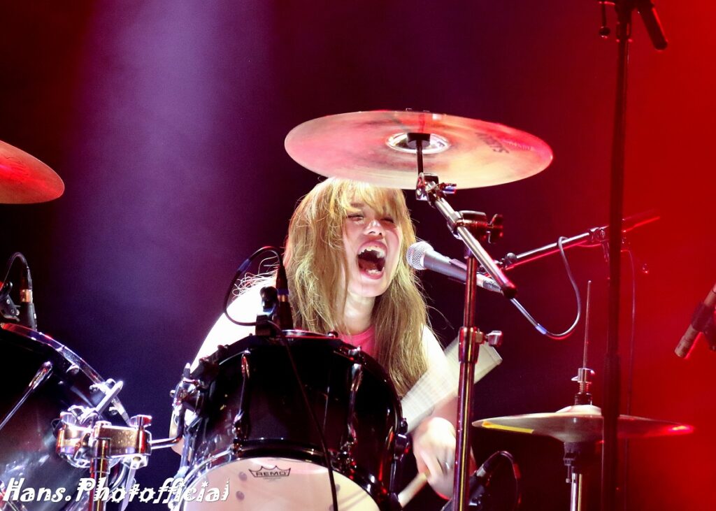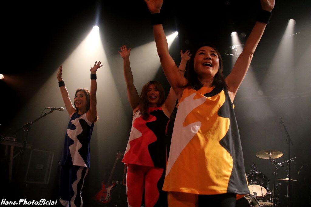 Een optreden lang drumde ze met een podiumbrede glimlach op de lippen, ze zat te headbangen op een manier die iedereen in een deuk deed liggen en stond vaak ook gewoon recht te drummen. Ze zag er een optreden lang uit als een klein meisje dat snoepjes mocht uitkiezen en te horen kreeg dat ze naar Disneyland mocht met haar vriendjes. Iemand naast ons riep uitgelaten ‘I wanna marry the drummer, she is amazing’. Halverwege de set werd toch even aandacht besteed aan de nieuwe plaat met Mujinto Rock en Nice Day, maar we kregen snel weer de hilarische songs te horen die hen onsterfelijk maakten. Sweet Candy Power, Buttercup en het grappig aangekondigde I’m A Cat, in traditioneel gebrekkig Engels, zetten de rotonde definitief op haar kop. Eigenlijk deden ze ons best wel aan B52’s denken. Die speelden geweldige popsongs met veel new wave invloeden, maar hadden ook leuke outfits en het ging ook over kreeften en planeten en serieuze teksten werden ook gemeden.