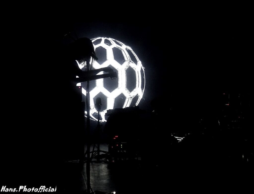 Na hun passages op Dour en de Lokerse Feesten vorige festivalzomer wisten we welk introvlees we in de kuip hadden. Een visuele backdrop van een hexagon-bol die om zijn eigen as tolde, kondigde de start van de show aan. De draaisnelheid van de bol werd met psychedelisch verantwoorde synths, voor het overige een zeldzame eend in de riffbijt, aangestuurd en op kruissnelheid gebracht, een snelheid die het concert niet meer zou verliezen. Het nieuwe Ilion van de gelijknamige nieuwe plaat ging mooi over in het al even nieuwe Nimh. Je zag de rare spaghettiwezens die de hoes van de plaat sieren als het ware op je afkomen, het dreigingsniveau was minstens code oranje met een rode rand.