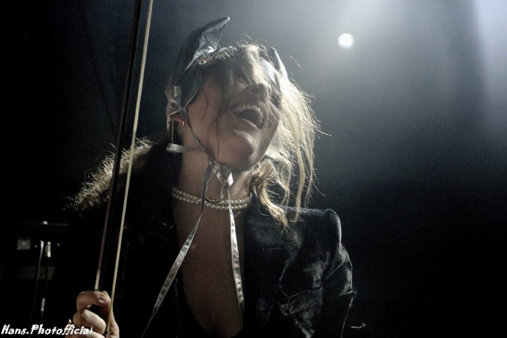 Voorspelbaar zou de setlist nooit worden. De volgorde op plaat werd duchtig omgegooid. Zo waren Underwater en Moonman ook live een koppel maar wel pas zowat halfweg de set en zelfs nà Cruel dat op plaat diep in de finale zit. Cruel etaleerde een hoge dosis Chelsea Wolfe met dus een flinke scheut gothic doom folk. Het betekent vooral ook dat Justine een geweldige zangeres is, wat we uiteraard in het verleden ook al hadden aangehaald. Haar viooltje werd minder vaak dan voorheen in de vuurlinie gegooid maar dat drukte de pret niet want Trui zorgde voor contragewicht met bas en cello. Underwater klonk geweldig want combineerde carnavaleske percussie met een soort ingehouden treurnis. Dit was bijzonder overtuigend gebracht. Dit nummer paste ook als gegoten bij Moonman hoewel dit op het eerste gehoor totaal andere vibes opwekte. De percussie was hier minder zuiders maar even oppompend. Hier was het hoge vocaal uithalen van Justine verantwoordelijk voor de feestelijker vibe die ons overmeesterde.