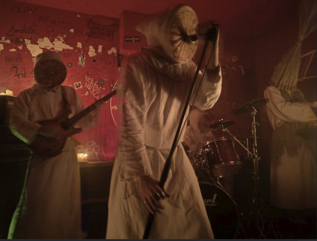Na een korte podiumwissel betraden enkele heren het podium om alles klaar te zetten. Een band als elke andere. Maar dat was buiten de waard gerekend. Ze verlieten kort het podium en kwamen, begeleid door een vrijwilliger, het café weer binnen richting podium, getooid in maskers / hoofddeksels die ze ook in de getoonde videoclip op hadden. Ze zagen geen flikker door die dingen, maar het zag er magistraal uit, vooral de toetsenist wiens hoofddeksel zowaar net het plafond niet raakte. Warm zal hij het gehad hebben, op zoek naar een streepje licht om zijn instrument te kunnen bespelen. Een paar kaarsen op het podium, een vaas verlepte bloemen en hop, ze begonnen aan een set hemelse eigenzinnige door imkers en bijen geïnspireerde set blackmetal om tenen en vingers bij af te likken.