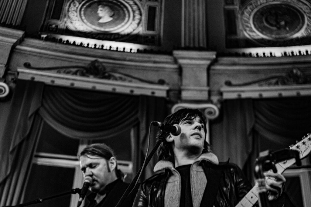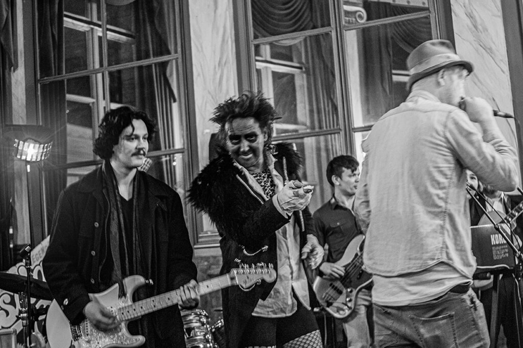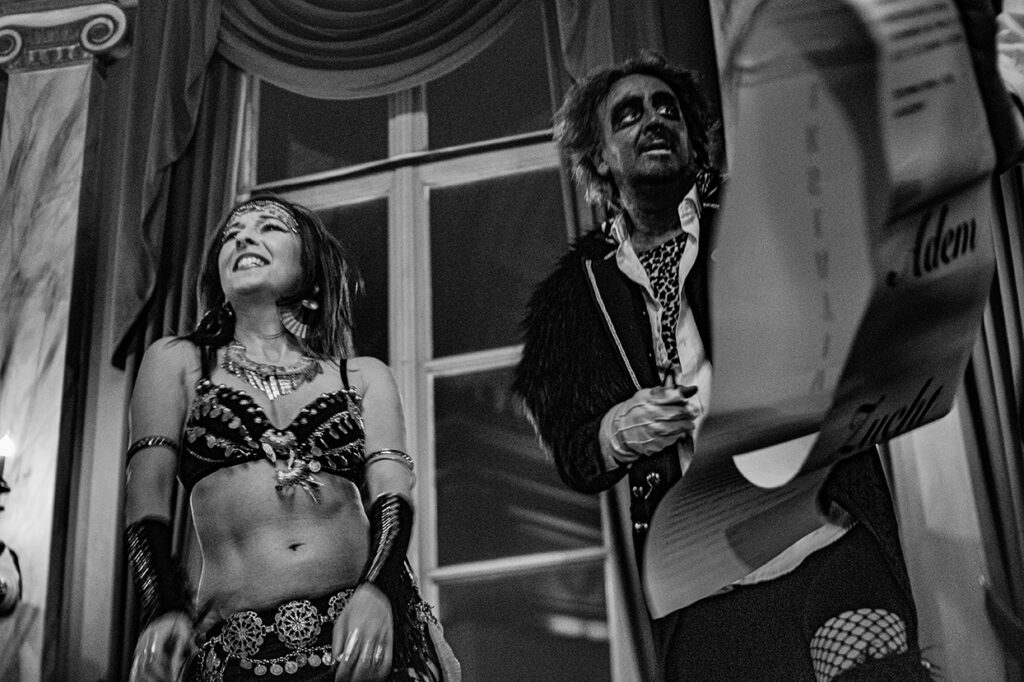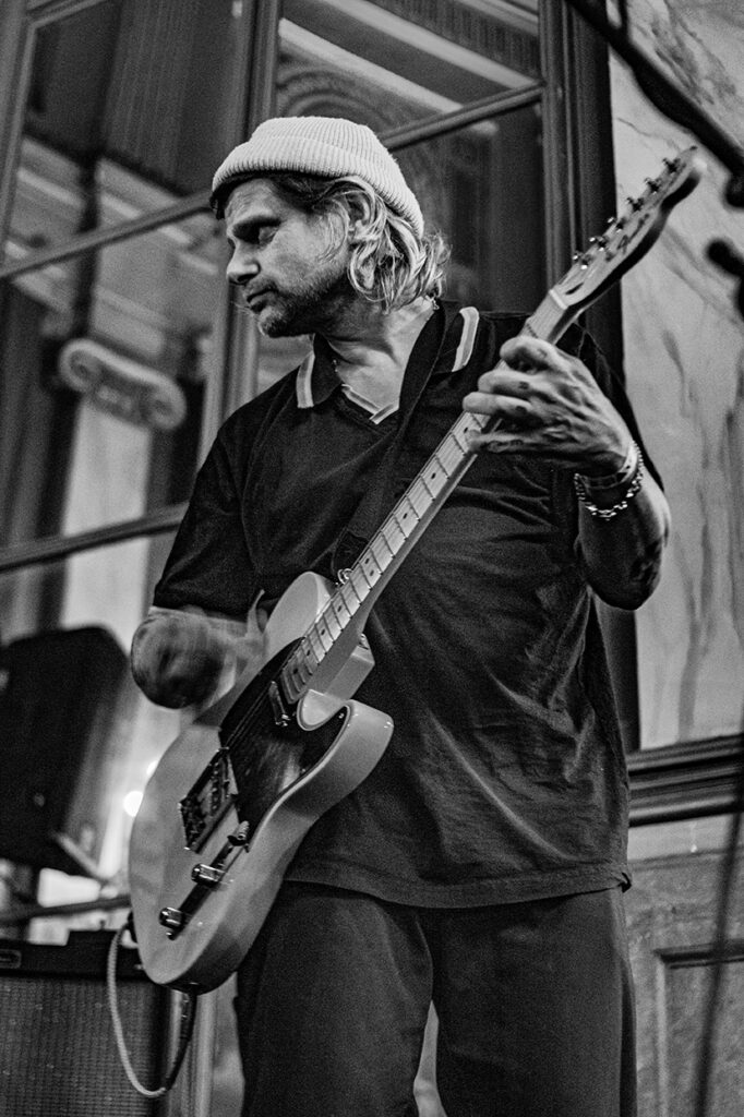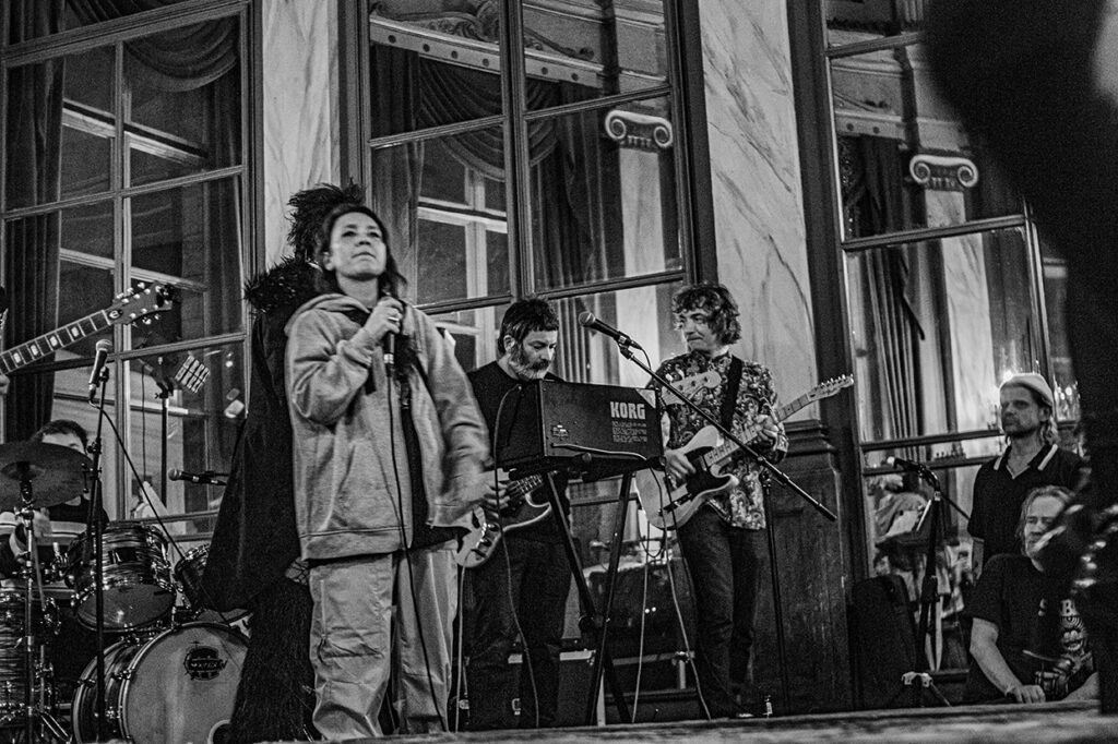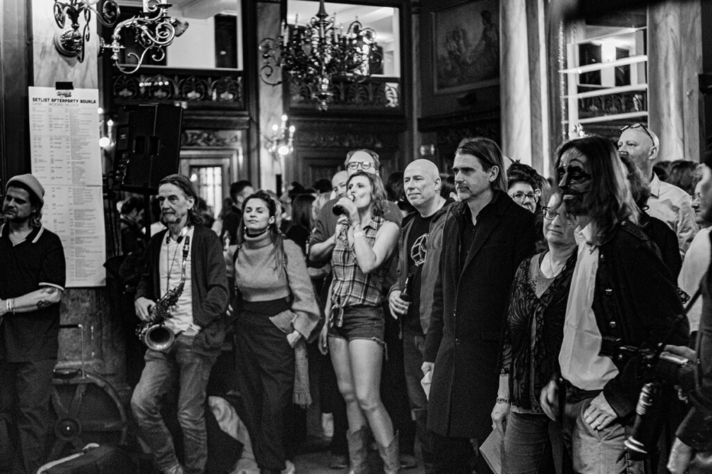 “Waar zijn al die fucking bassisten”, riep Gothicsmurf plots in de micro. De eerste bassist beklom na een tijdje het podium. Ride Into The Sun kreeg wat meer drive en David Bovée kwam erbij en probeerde het nummer een draai richting soulfunk te geven. Na een tijdje lukte dat. De geluidsman had blijkbaar ambras met zijn lief, en was naar huis gegaan. Niemand achter de knoppen. Bij momenten een geluidsbrij, en van de dichters was soms weinig te verstaan. Maar ze waren erbij, deze in de koekenstad gecensureerde wezens. En zo ging het maar door terwijl Ride into the Sun een Parijse twist kreeg met een dame in jarentwintig glitterjurk en wat later overging in de 60’s-vibe van Hash Bamboo Shuffle.