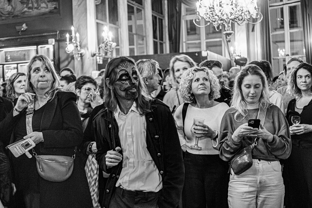 En al dat schoon volk zakte af naar de Bourla waar in de grote zaal iets tussen een bonte avond en een hoogstaand literair evenement gebeurde. Inclusief majoretten. En een polonaise in de overvolle, tot in de balkons gevulde zaal. Het publiek was al event bont en dito gekleed als de artiesten op het podium. Die laatsten moeten met meer dan honderd geweest zijn. Wegens gebrek aan podiummeester liep het feestje al gauw uit, om te eindigen met een tombola en een majorettenstoet richting foyer.