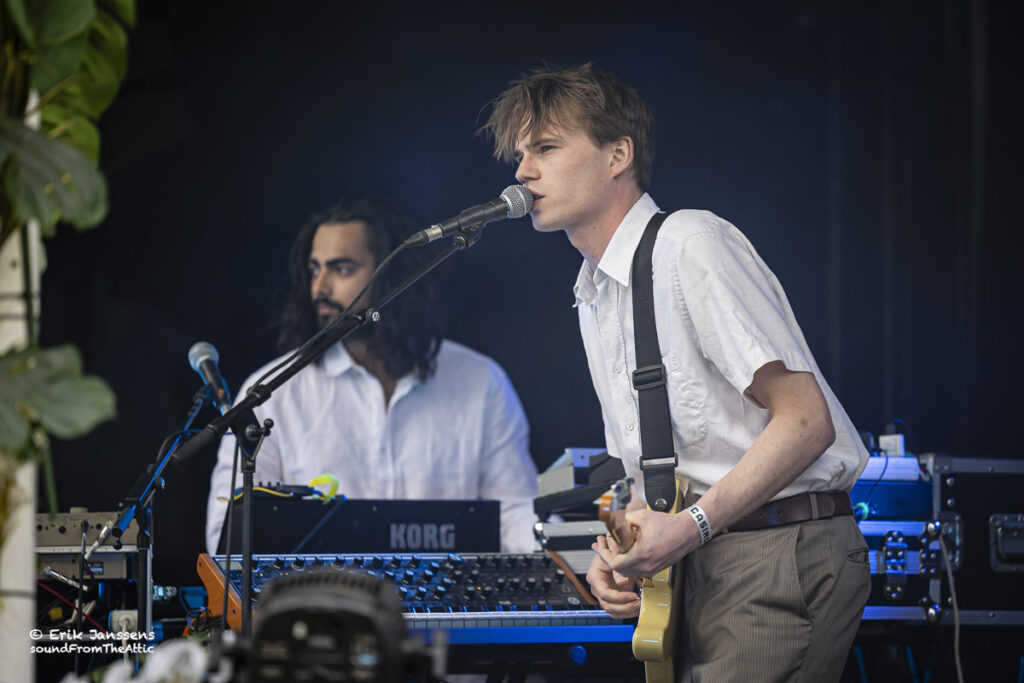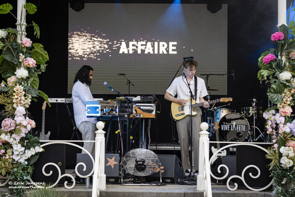 Affaire is een Belgisch duo, gevormd door Michiel Ritzen en Nick Caers en mocht het publiek opwarmen. Hun muziek is een opwindende mix van dravende drumcomputers, een arsenaal aan vintage synths, stuwende gitaren en onstuimige vocalen. Daarmee creëren ze een dansbare off-beat combinatie van elektronica en artrock. Affaire brengt een uitgesproken avant-garde sfeer die tegelijk direct en ritmisch blijft – een compromisloze blend van experimenteerdrift en pure dansbaarheid.