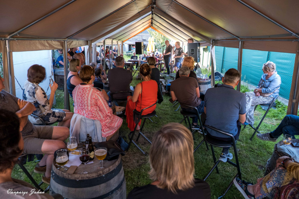 Een van de charmes van zo’n intieme optredens, is het directe contact tussen muzikanten en het publiek. Peter praat de nummers aan mekaar met speciale weetjes over zijn nummers en opmerkingen en vaststellingen over van de plaats waar hij optreedt.
