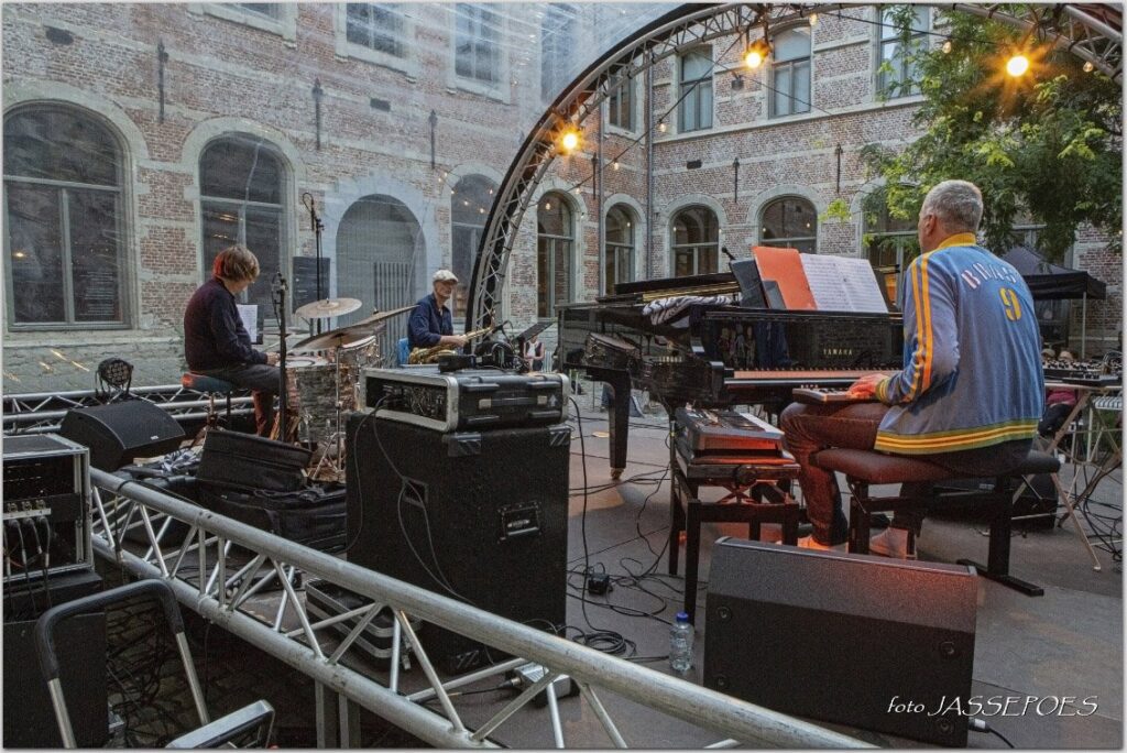 Vrijdagavond 15 juli 2022 speelde het Frank Deruytter Trio ten dans op het binnenplein van Het Predikheren. Net niet letterlijk, al waren heel wat melomanen uiterste beweeglijk op de stoeltjes. “Een dansvloer ontbreekt hier eigenlijk nog”, merkte een metgezel op de eerste rij terecht op. Wie stiekem een blik op de set list op het podium wierp, met daarop titels als Battle, Go Ahead R, Manic Song, of ook Dance for The C kon al vermoeden dat het géén easy listening set zou worden. En in onze notities lezen we ‘gaan met die banaan‘, ‘wat een power‘ en ook nog ‘alles kaputt‘.