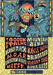 Eindigen deden we uiteindelijk met The Gooch Palms (LA, US) een pop/punk duo met enkel gitaar, drum en zang dat het rock’ n rollgehalte nog eens sterk de hoogte in bracht. Halverwege de set ging de zanger/gitarist uit de kleren en speelde de rest van zijn set enkel nog met schoenen aan. Het publiek ging daarna ook gewoon wild tot het einde van hun show. Een beleving om u tegen te zeggen! En een mooie afsluiter van de avond.