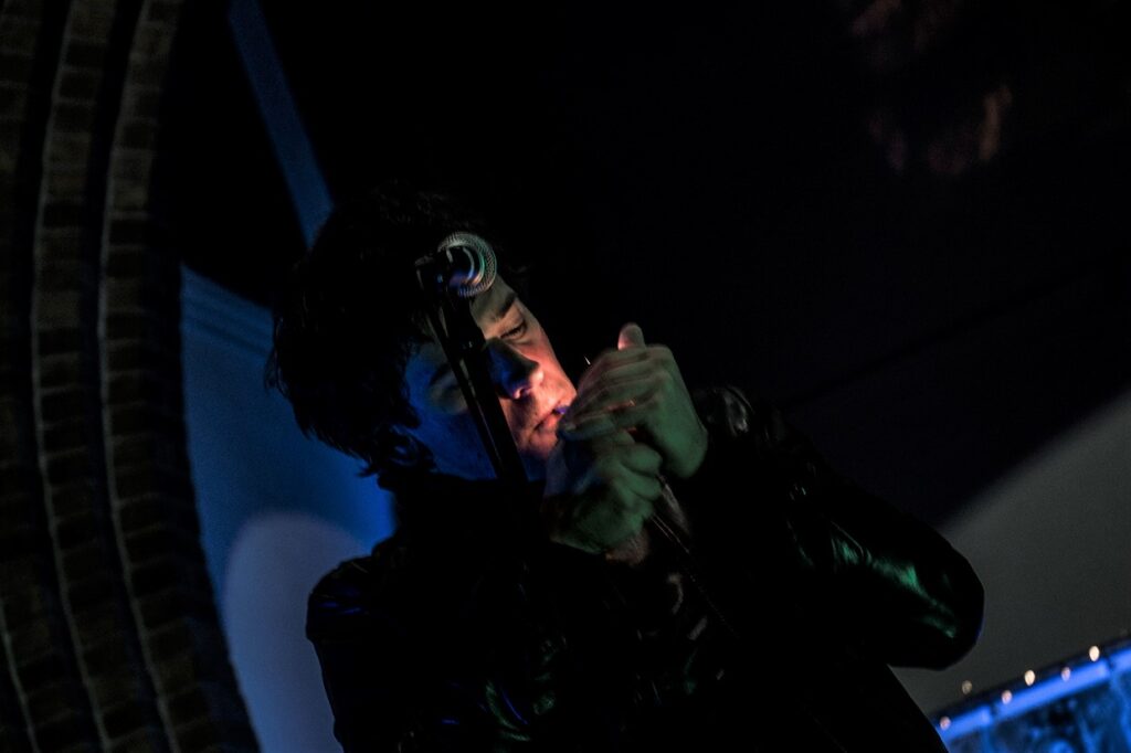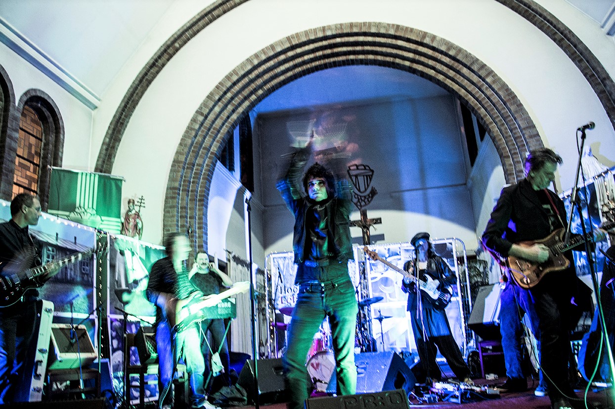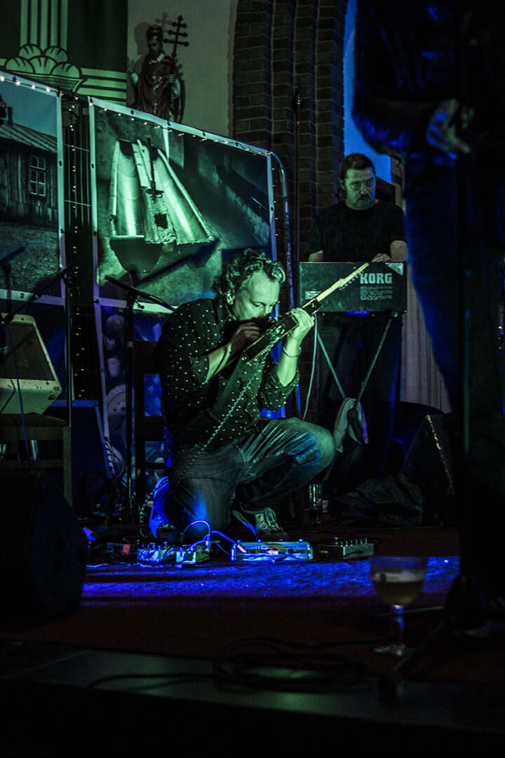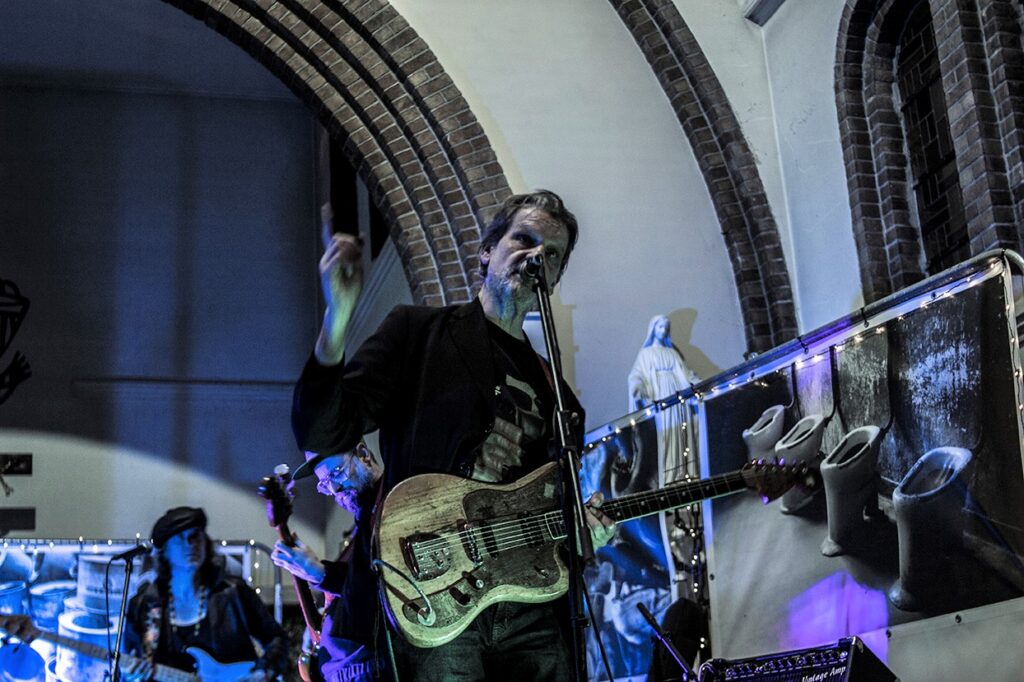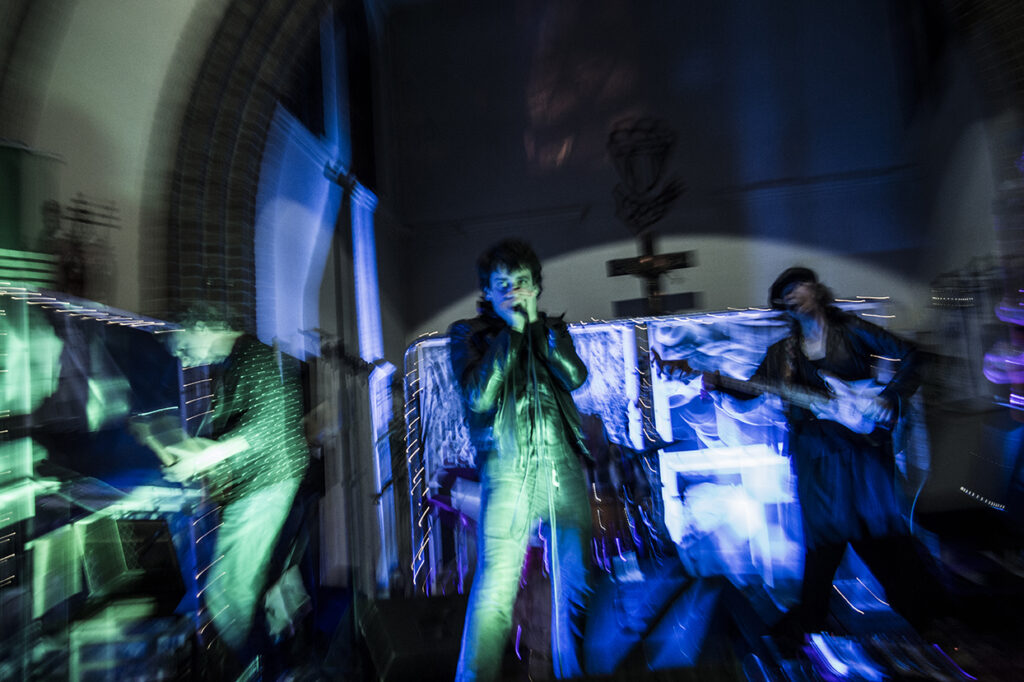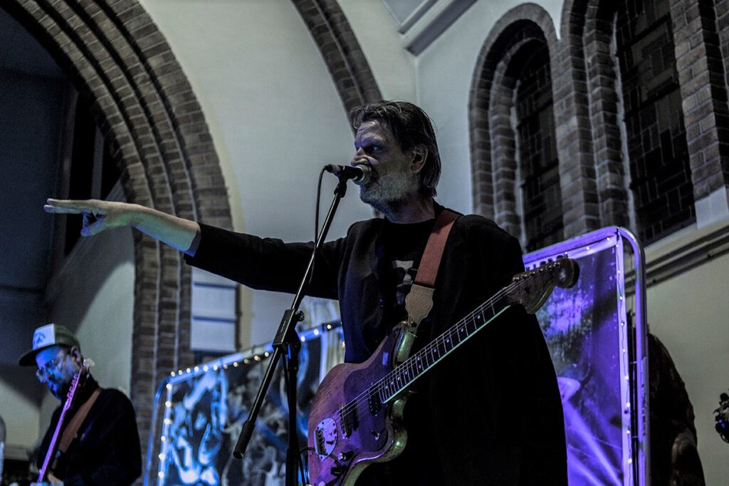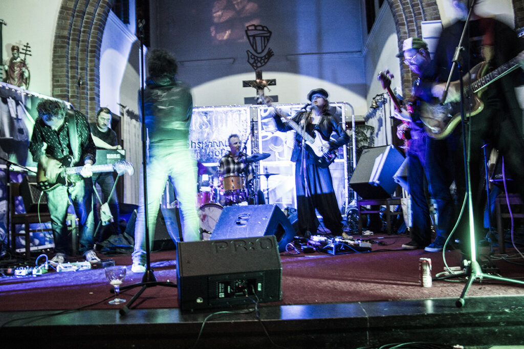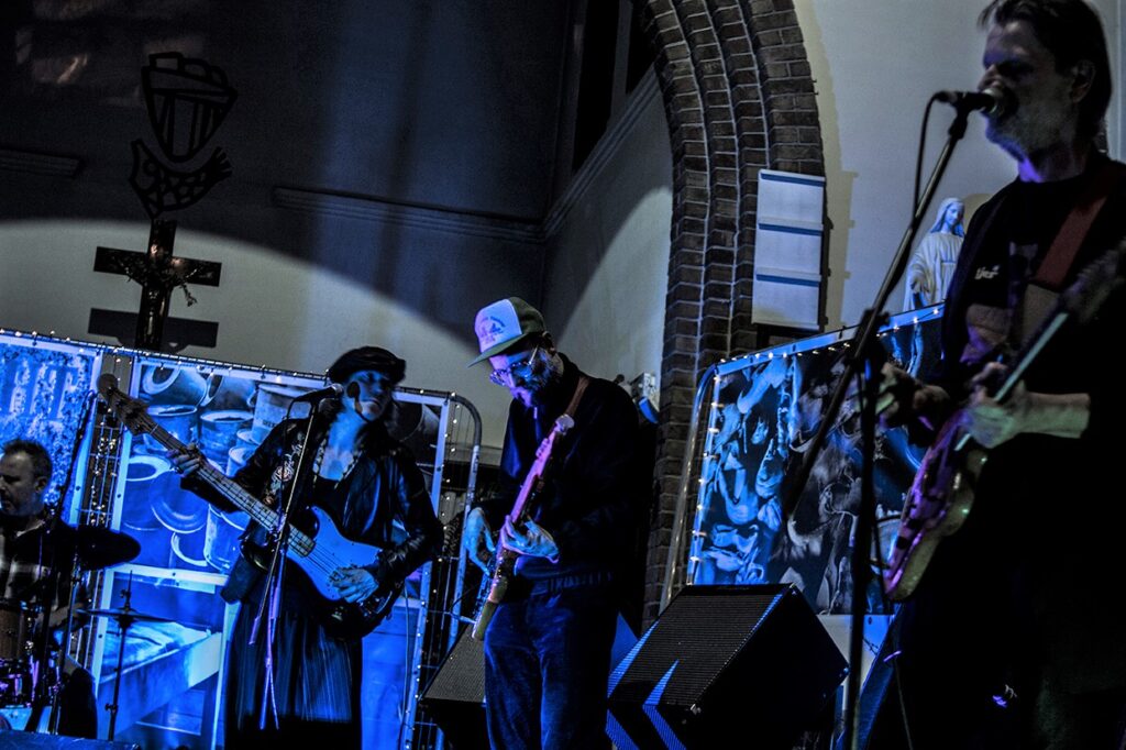 De kerk is spookachtig groen uitgelicht, en er is een expo aan de gang. Met de mannen die op de plek van het altaar staan, kan je makkelijk een seizoen van Belpop vullen. Ze spelen/speelden bij Dead Man Ray, Zita Swoon, dEUS, Mercelis, Dez Mona, Roland, FES, … Gasten die het allemaal al meegemaakt hebben, en hier nu voor hun plezier staan en hun ego hebben thuisgelaten. En dat merk je ook. Niemand vervalt in notenneukerij en als een nummer te lang duurt, maakt Trouvé er een einde aan.