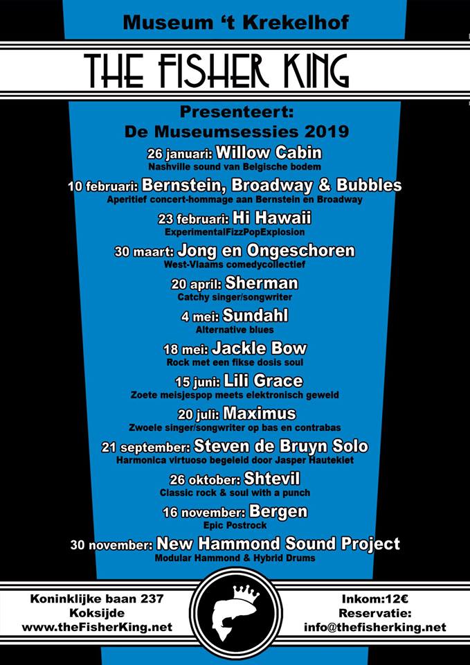 In het rariteitenkabinet aka ambachtenmuseum Krekelhof in St-Idesbald, Koksijde huist een mixed arts collectief. Curators zijn Vincent en Nina, een sympathiek koppel tatoeëerders met wereldfaam (The Fisher King ) die ongeveer iedere maand een platform bieden aan kunstenaars allerhande. De ene keer stand-up comedy, de andere keer opera, broadway, pop of rock. In het verleden kregen we hier bijvoorbeeld al de klein grote William Bouva en de grote kleine Garland Jeffreys voor de neus. Lokale grootheden en internationale wereldsterren dus.